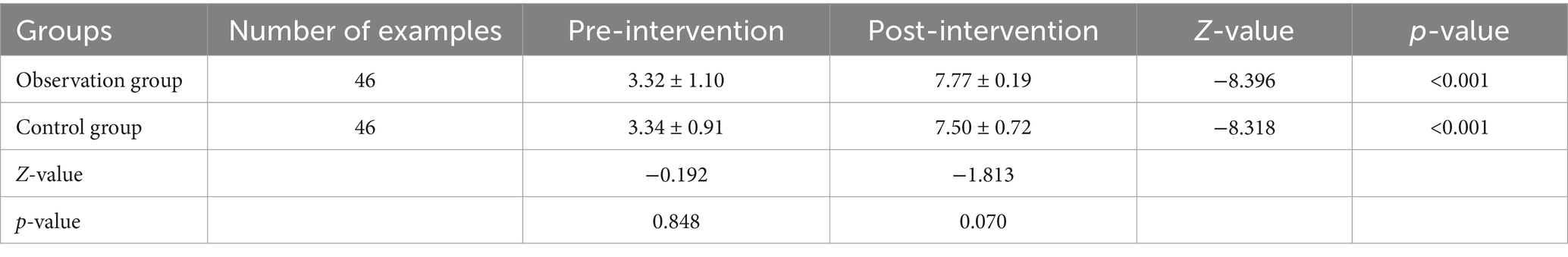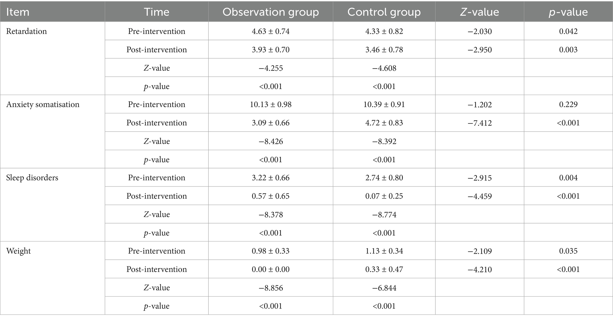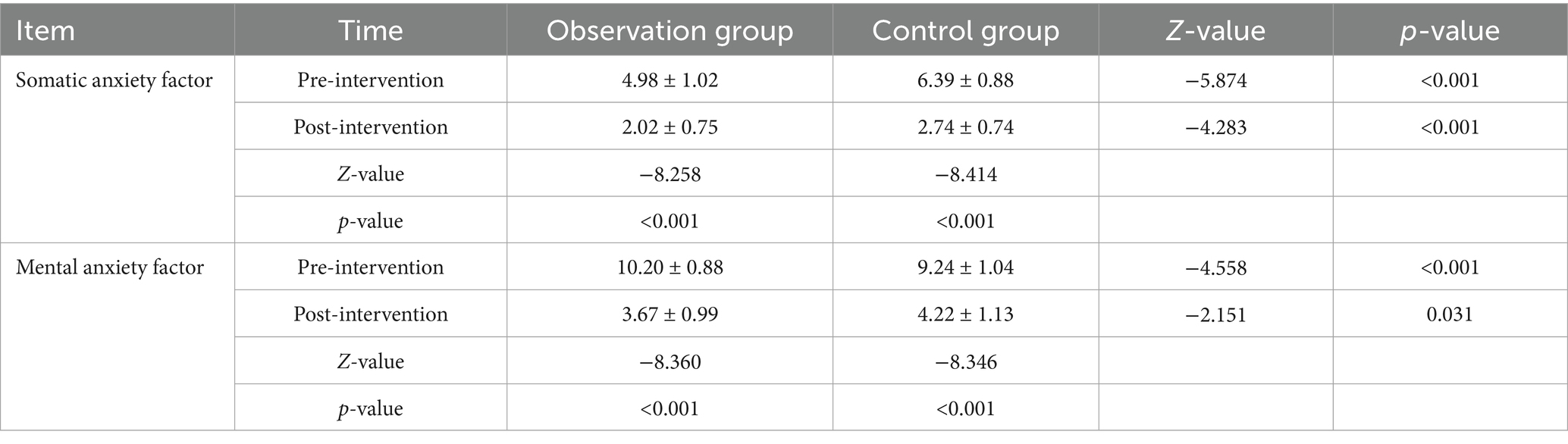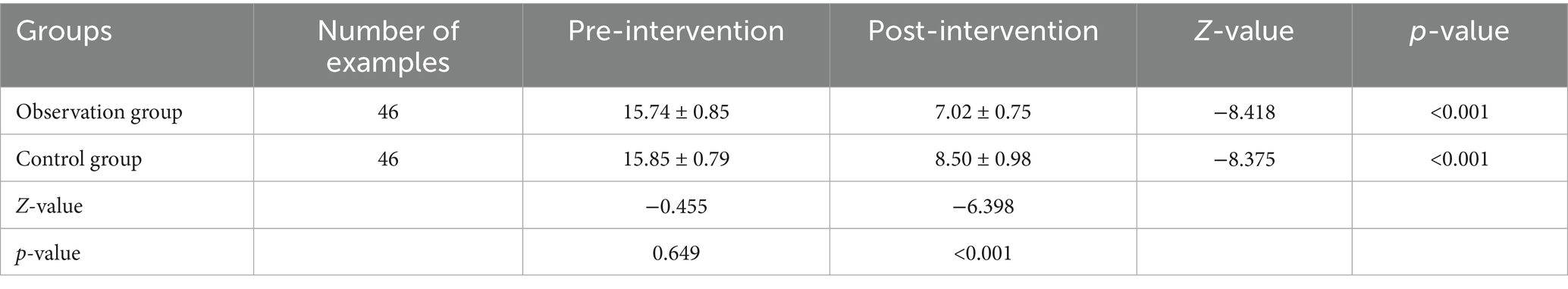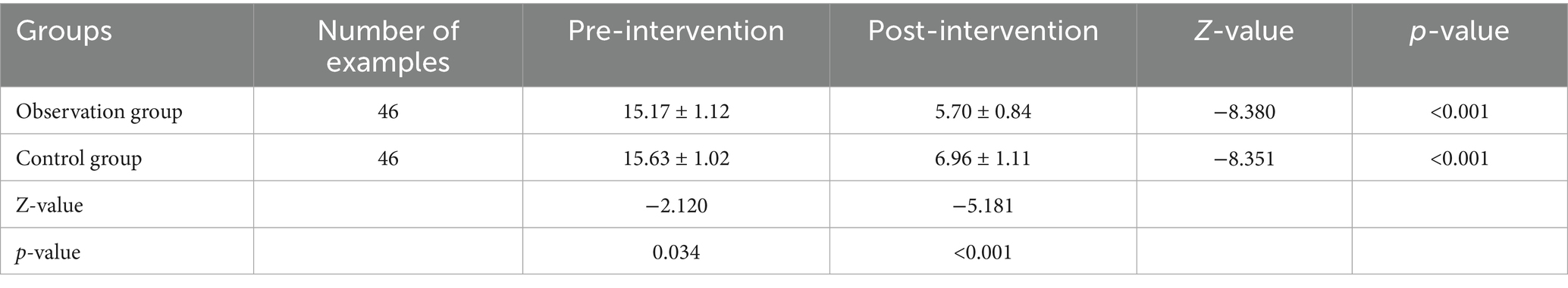 After the intervention, the scores of each item in the observation group were lower than those in the control group, and the difference between the data of the two groups before and after the intervention was significant (p < 0.05), see Table 9.