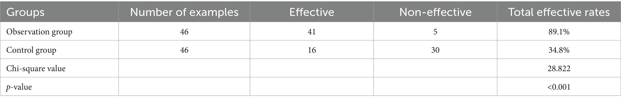 Comparison of HAMA effective rate, the observation group was higher than the control group (p < 0.05), see Table 6.