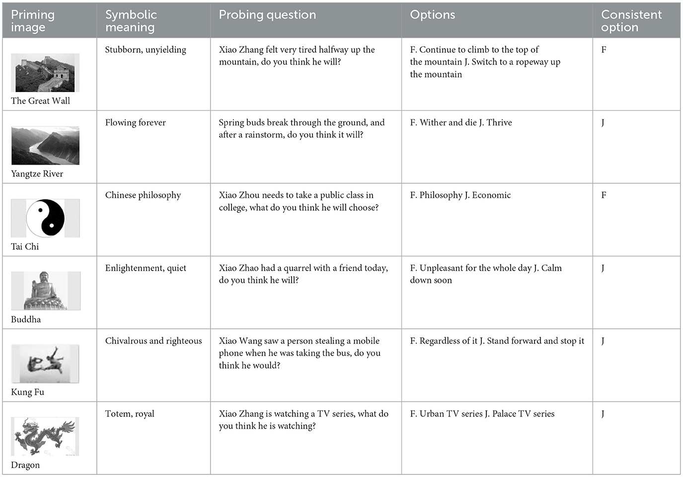 The priming effect paradigm is a crucial framework for studying unconscious processes. To investigate the priming effect of cultural unconsciousness, Study 2 adopted a between-subjects design with experimental and control groups. For participants in the experimental group, representative images of Chinese cultural archetypes were presented as priming stimuli, followed by scenario-based questions (target stimuli) requiring participants to make a choice. In contrast, participants in the control group proceeded directly to the same scenario-based questions without viewing the priming images.