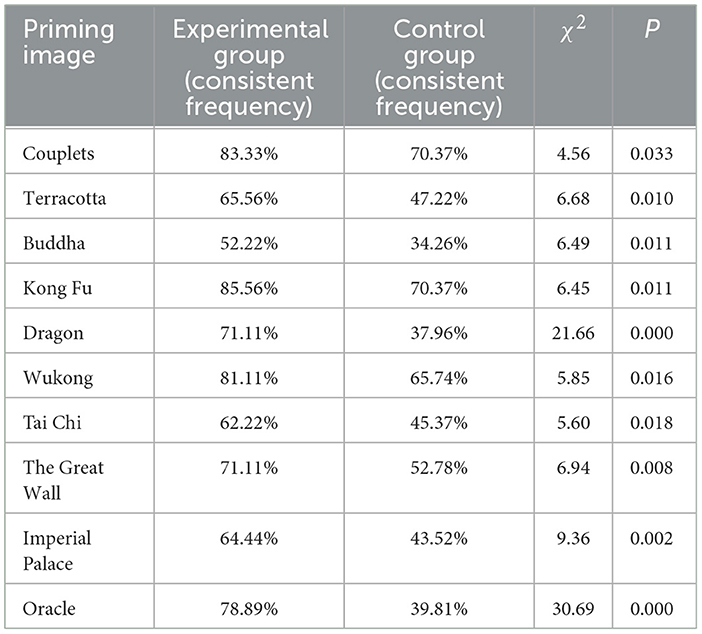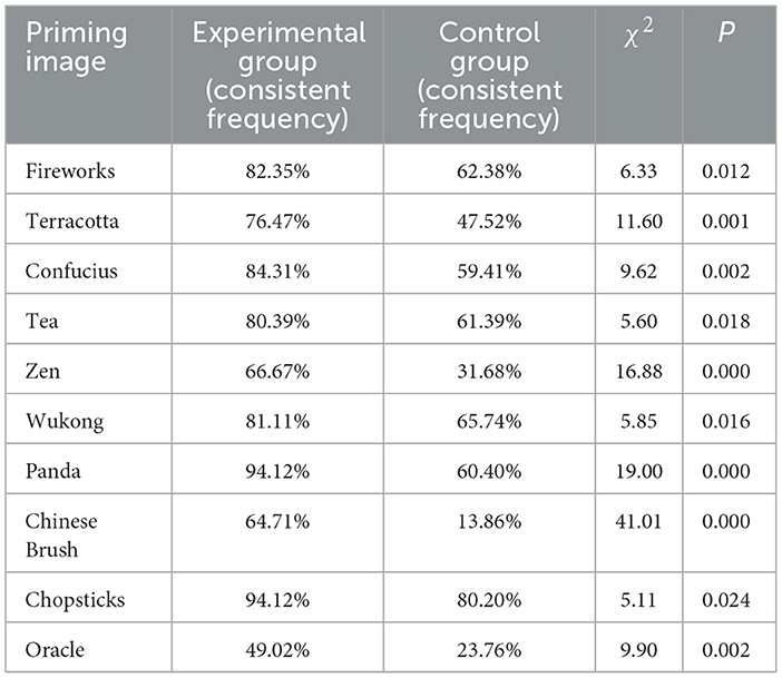 For example, consider the analysis of results for the Chinese cultural archetypal image “firecrackers”. The corresponding probe task was as follows: “Question: In the early morning, Xiao Yang left home as usual. What do you think will happen to him today? Options: F. A regular day; J. Something good happens.” Option J is consistent with the symbolic meaning of firecrackers, which is “celebration”. The experimental results revealed that, among the 90 participants in the experimental group, 57 selected a consistent response (63.33%), whereas 26 of the 108 control group participants selected a consistent response (24.07%). A chi-square test revealed that the experimental group's consistency of choice was significantly higher than that of the control group (χ2 = 31.08, p < 0.001).