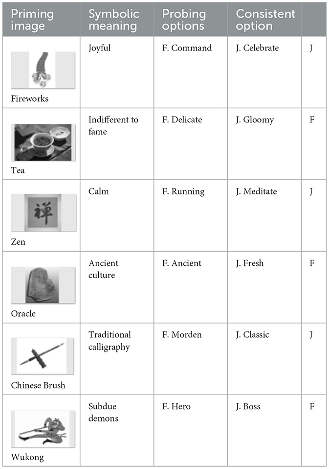 The experiment consisted of 50 trials in total, each with one Chinese cultural archetype image as the priming stimulus and one corresponding probe task, all presented in random order. To balance the responses, 25 consistent and 25 inconsistent options in the probe tasks were assigned to the “F” and “J” keys. The experiment concluded once the participants had completed all 50 trials.
