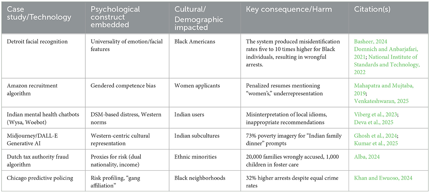 These cases illustrate how psychological constructs, when uncritically embedded into AI, can entrench and even amplify social inequities. Table 1 summarizes additional real-world examples of psychological constructs in AI systems and their resulting sociocultural impacts.