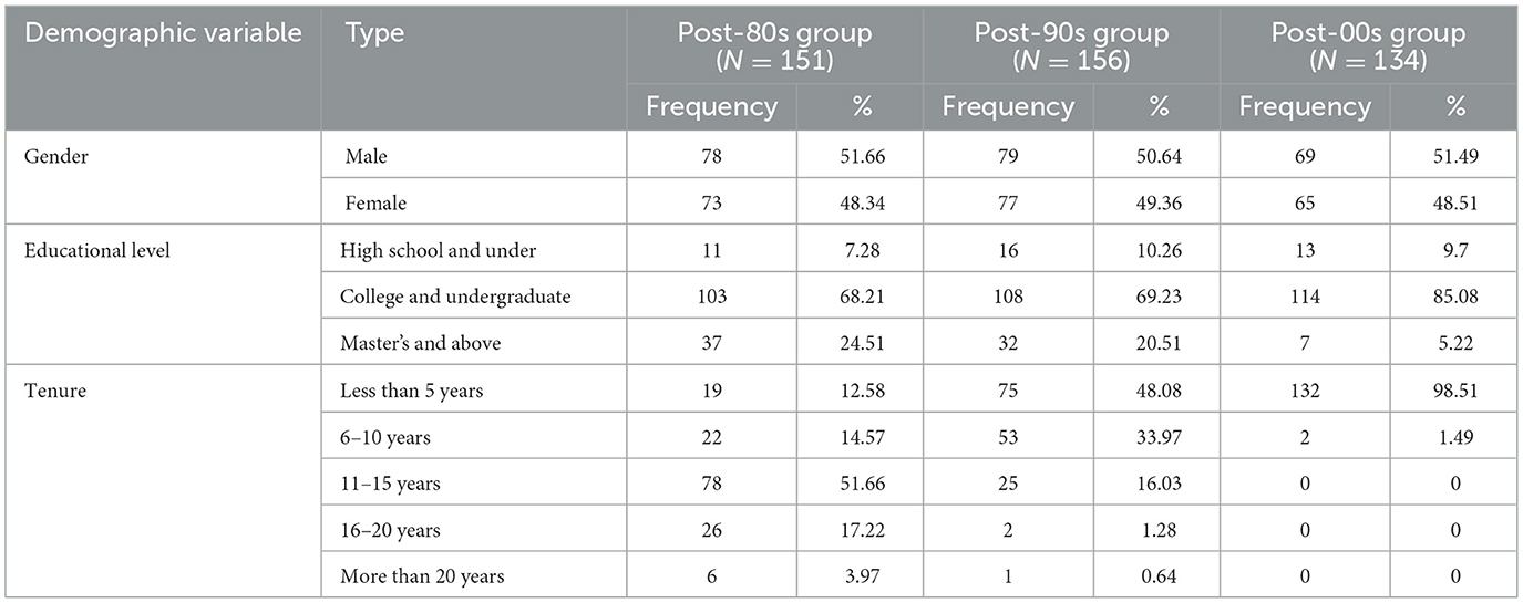To ensure a balanced representation of the three generational groups, questionnaires were distributed to local universities, research institutes, and specialized survey agencies, who were entrusted with handling the distribution process and keeping the number of participants from each generational group approximately equal. Random sampling was then performed. To ensure the authenticity and validity of the data, emotionally charged language was avoided, the names of relevant variables were hidden, and questions were designed to avoid social desirability bias. Additionally, the purpose of this survey was explained to the participants and they were assured that their responses would remain confidential to alleviate any concerns. Finally, responses were received from a diverse and representative sample of participants. Of the 540 questionnaires, 441 valid responses were received, for a response rate of 81.7%. To achieve a relatively balanced sample size between the groups for better comparisons, we randomly selected a sample of 160 participants from each group based on generational differences. From these participants, we further collected a valid sample of participants, and finally came up with 151 participants from the Post-80s group, 156 participants from the Post-90s group, and 134 participants from the Post-00s group, for a total of 441 participants (the full-sample group). Participants' demographic characteristics are listed in Table 1, the names of relevant variables were hidden, and questions were designed to avoid social desirability bias. Additionally, the purpose of this survey was explained to the participants and they were assured that their responses would remain confidential to alleviate any concerns. Finally, responses were received from a diverse and representative sample of participants. Of the 540 questionnaires, 441 valid responses were received, for a response rate of 81.7%. To achieve a relatively balanced sample size between the groups for better comparisons, we randomly selected a sample of 160 participants from each group based on generational differences. From these participants, we further collected a valid sample of participants, and finally came up with 151 participants from the Post-80s group, 156 participants from the Post-90s group, and 134 participants from the Post-00s group, for a total of 441 participants (the full-sample group). Participants' demographic characteristics are listed in Table 1.