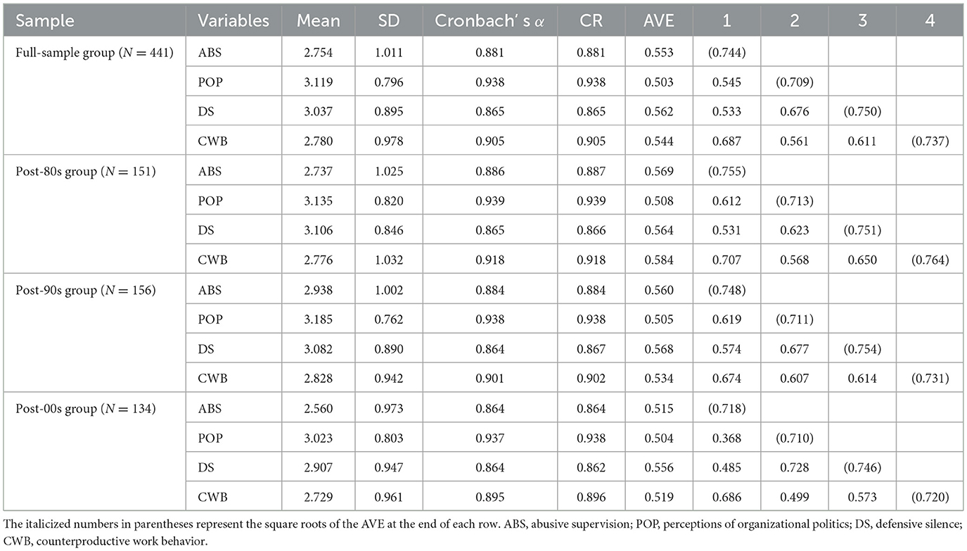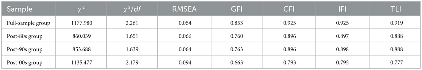 Amos 26.0 and SPSS 25.0 software were used for analysis. As Table 2 shows, the reliability of the constructs for each group was greater than 0.8, the composite reliability (CR) value was greater than 0.7, and the average variance extracted (AVE) was greater than 0.5. Additionally, for each variable, the square root of its AVE was higher than the correlation between itself and the other variables for all datasets. The tests indicate that the correlation coefficients for the full sample, Post-80s, Post-90s, and Post-00s cohorts are all below 0.8, demonstrating no multicollinearity issues.