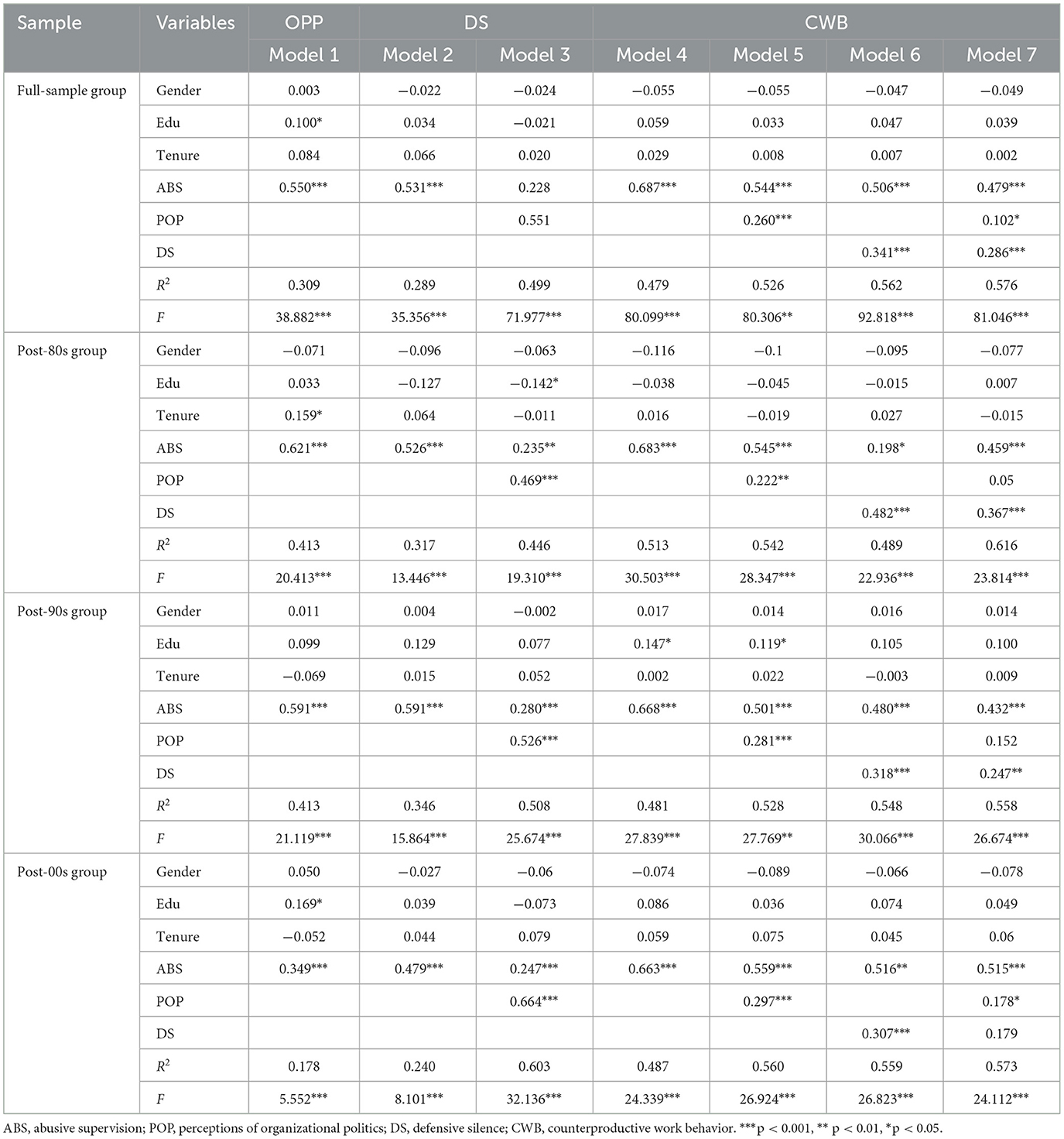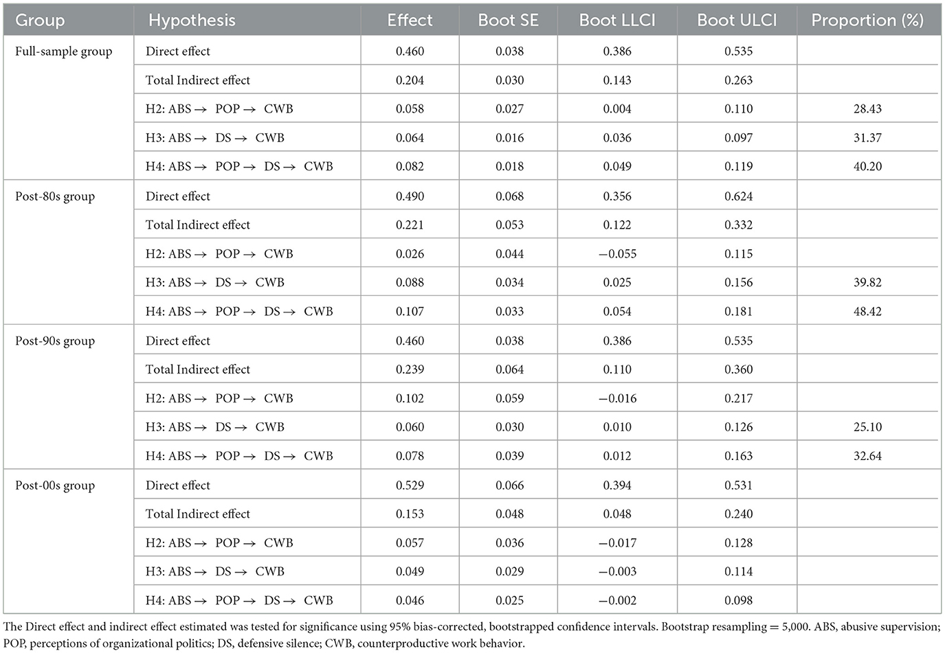 To address the limitations of hierarchical regression analyses, the mediating effect between all groups was further tested using the PROCESS (Model 6) bootstrapping method with 5,000 resamples. Hypotheses 3 and 5 tested the mediating effect of POP and defensive silence. The results indicated that abusive supervision had a significant indirect effect on counterproductive work behaviors through POP (β = 0.058, 95% CI = 0.004–0.110), supporting H3. However, the results were different for the three generational groups, with the indirect effects for the Post-80s, Post-90s, and Post-00s groups (β = 0.026, 95% CI = −0.055–0.115), (β = 0.102, 95% CI = −0.034–0.217), and (β =0.057, 95% CI = −0.017–0.128), respectively. The Post-80s, Post-90s and Post-00s groups had a confidence interval containing 0, which did not serve as a mediator. So H4 was rejected.