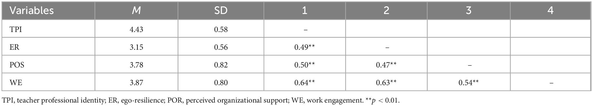 The results of correlation among the main variables showed that teacher professional identity positively related to ego-resilience (r = 0.49, p < 0.01), perceived organizational support (r = 0.50, p < 0.01), and work engagement (r = 0.64, p < 0.01); Ego-resilience positively related to perceived organizational support (r = 0.47, p < 0.01), and work engagement (r = 0.63, p < 0.01); Perceived organizational support positively related to work engagement (r = 0.54, p < 0.01). The specific results can be seen in Table 1.