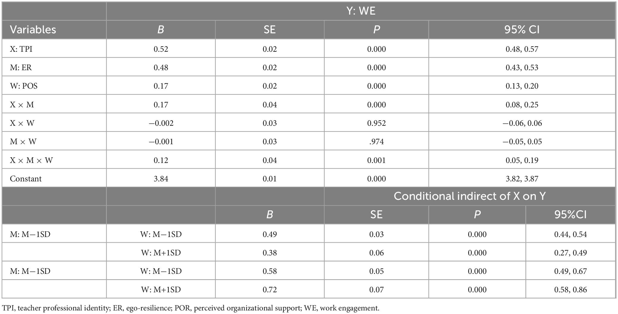 Model 3 (Process macro in SPSS 25.0, Hayes, 2013) was used to test the moderating roles of ego-resilience and perceived organizational support in the relationship between teacher professional identity and work engagement. Results showed that the interaction effect of teacher professional identity, ego-resilience, and perceived organizational support on work engagement was significant (B = 0.12, SE = 0.04, p = 0.001, 95% CI = 0.05 to 0.19). Further simple analysis showed that when scores of ego-resilience and perceived organizational support were high, the effect of teacher professional identity on work engagement was the biggest (B = 0.72, SE = 0.07, p = 0.000, 95% CI = 0.58 to 0.86). The specific results are shown in Table 2.