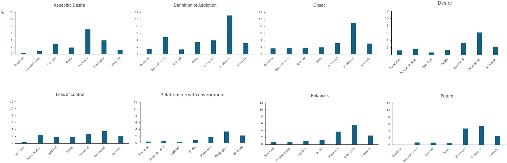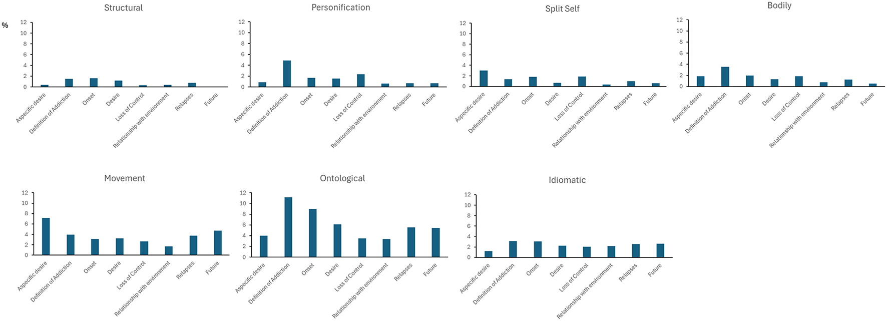 Further comparisons across metaphorical clusters within each thematic area revealed distinct patterns (Figure 3). In the narration of aspecific desire, movement metaphors occurred significantly more often than structural, personification, bodily, and idiomatic metaphors (all p < 0.001). Both the definition of addiction and onset narratives showed a consistent dominance of ontological metaphors over all other types, including structural, personification, split self , bodily, movement, and idiomatic metaphors (all p < 0.001). In the desire area, ontological metaphors were again significantly more frequent than structural (p = 0.010), personification (p = 0.041), split self (p < 0.001), and bodily metaphors (p = 0.014).