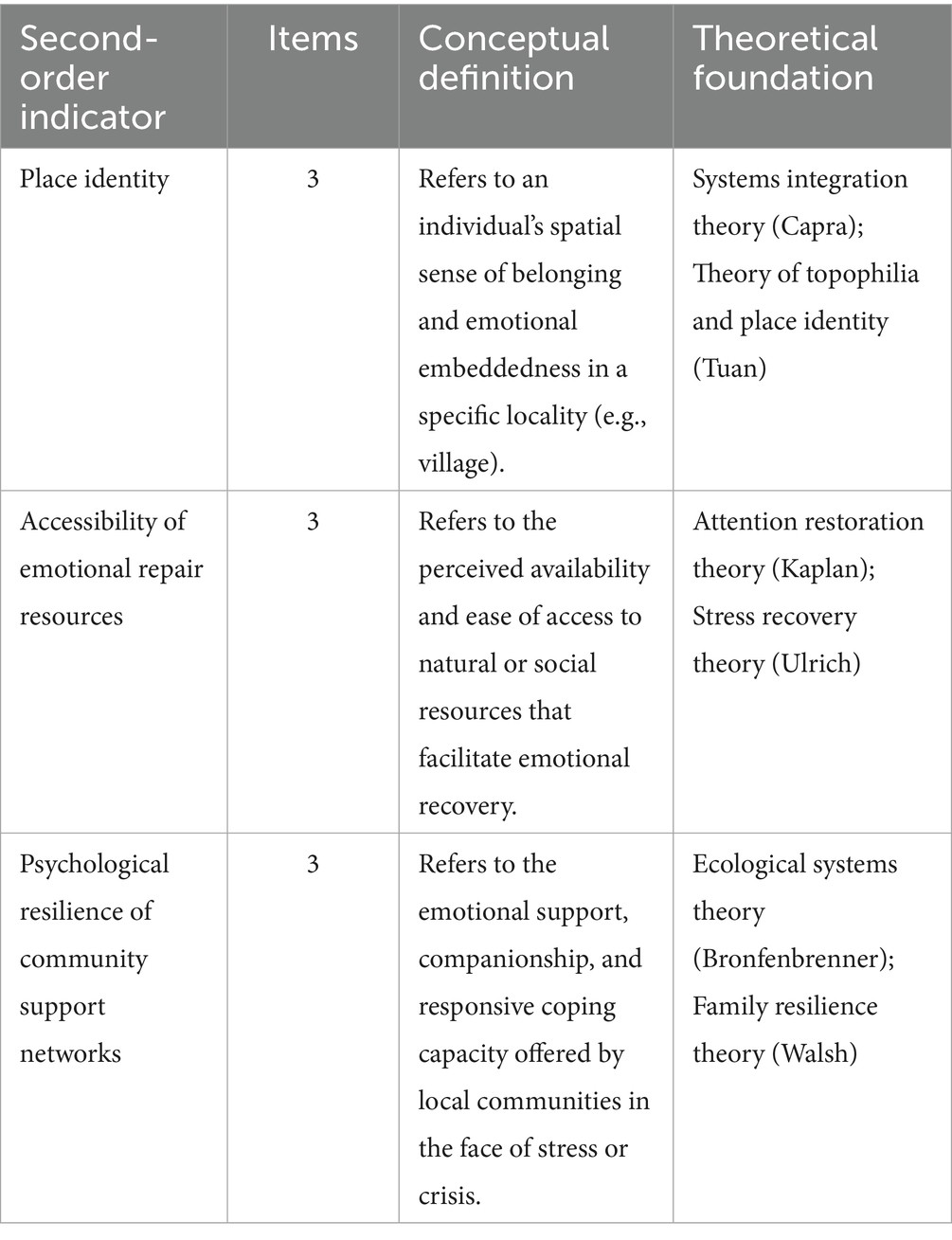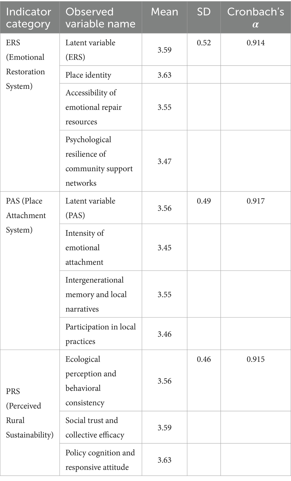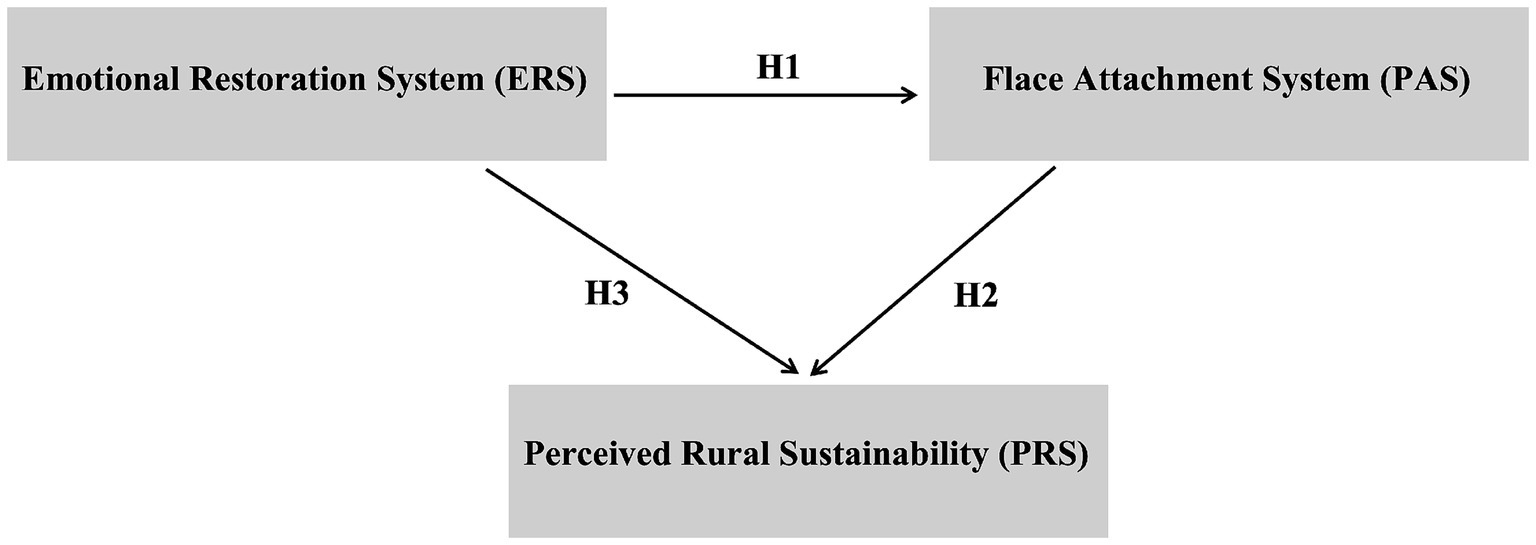 Within the theoretical framework, emotional restoration experiences have been shown to strengthen individuals’ place identity and attachment (ERS → PAS) (Korpela et al., 2001; Scannell and Gifford, 2010). Building on this foundation, the present study, situated within the systems psychology framework, posits that ERS and PAS together shape individuals’ perceptions of rural sustainability (PRS) through both direct and indirect pathways. Accordingly, the ERS → PAS → PRS pathway should not be viewed as a direct conclusion of existing theories, but rather as a hypothesized framework developed in this study through the integration of prior insights.