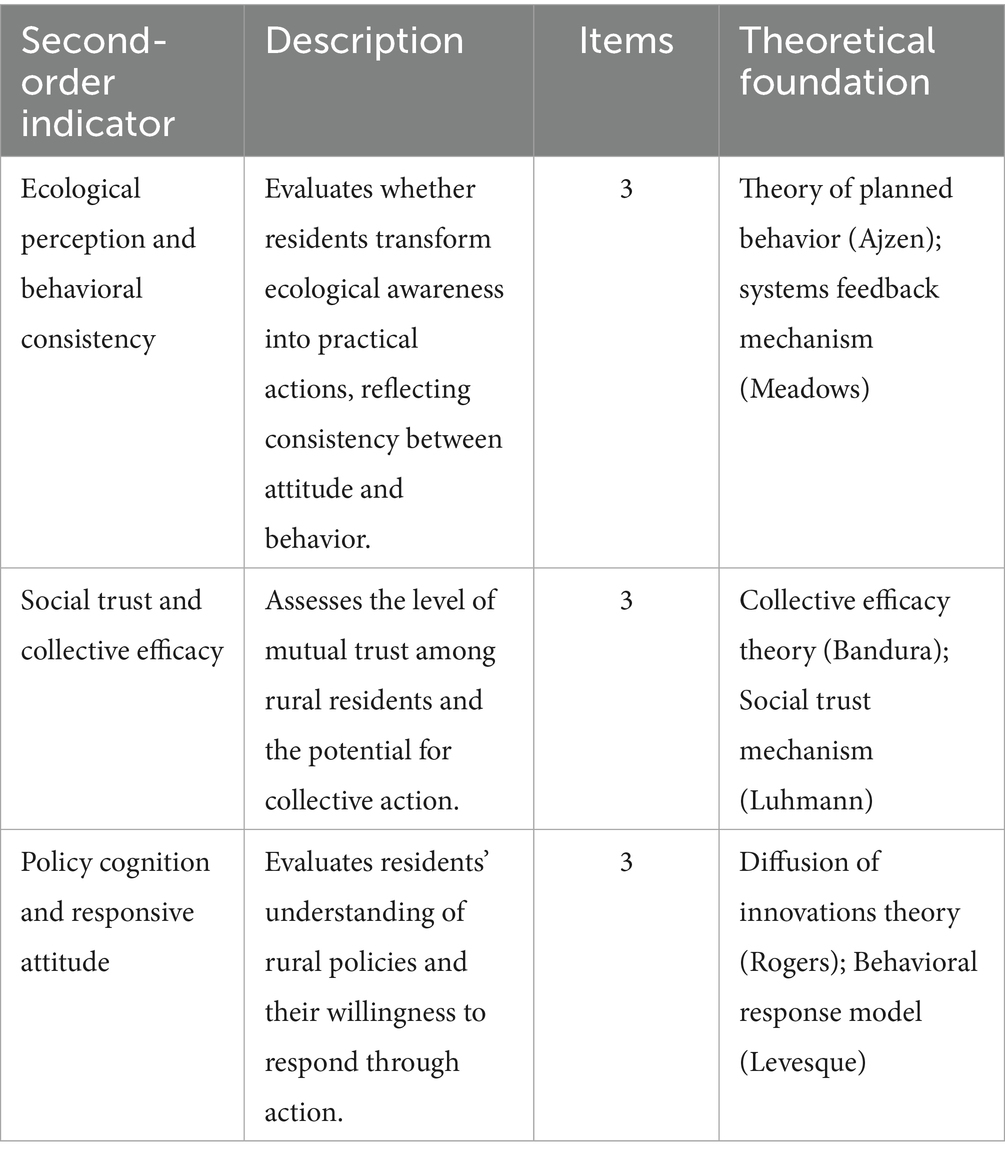 To balance validity with contextual relevance, this study employed measurement instruments that combined items adapted from established scales with items developed specifically for the rural Chinese setting. Constructs adapted from validated instruments included Place Identity and Emotional Attachment (Place Attachment Scale; Williams and Vaske, 2003; Kyle et al., 2005), Community Resilience (Connor and Davidson, 2003), Ecological–Cognitive Consistency (Ajzen, 1991), and Social Trust and Collective Efficacy (Bandura, 1997; Luhmann, 1979). In contrast, constructs such as Accessibility of Emotional Restoration Resources, Intergenerational Memory and Place Narratives, Place-Based Participation Practices, and Policy Cognition and Responsive Attitude were designed by the research team to capture mechanisms insufficiently addressed in existing scales. This integrative strategy ensured measurement rigor through the use of validated instruments, while also embedding contextual specificity by incorporating dimensions distinctive to rural sustainability transitions in China (see Table 1).
