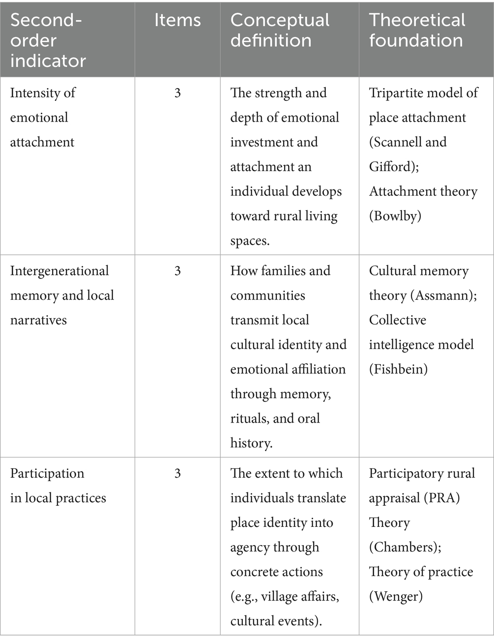 Amid ongoing rural transformation and changing urban–rural relations in many countries, place attachment has been recognized as an important psychological mechanism for understanding rural sustainability for evaluating rural sustainability (Masterson et al., 2019). Empirical studies across diverse countries and regions have demonstrated that place attachment influences not only individual environmental behavior but also the ways local culture is transmitted and social capital is maintained (Anton and Lawrence, 2016). However, notable differences remain in how place attachment is defined and applied across societal, cultural, and institutional contexts (Manzo and Perkins, 2006), which raises a central question: how can scholars build a framework of place attachment that is theoretically robust and comparable across different cultural contexts? Building on this comparative perspective, this study takes China as the research setting. Its rapid rural transformation and distinctive socio-cultural conditions offer a valuable case for examining place attachment and rural sustainability.