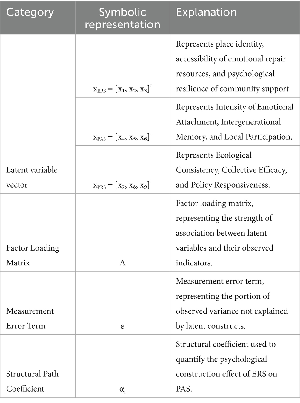 In this study, three core latent variables—Emotional Restoration System (ERS), Place Attachment System (PAS), and Perceived Rural Sustainability (PRS)—are constructed using a multivariate vector-based approach. A total of nine observed indicators are grouped into three dimensions latent structures, each corresponding to one psychological subsystem. The internal measurement logic is formalized through the following factor loading model, expressed in matrix notation (see Equation 1):