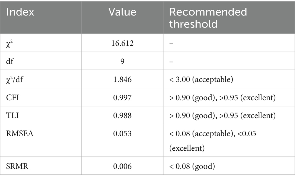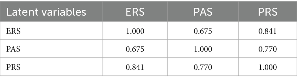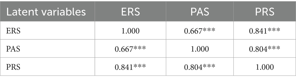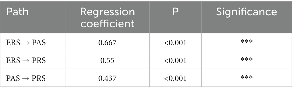 Table 11 presents the model fit indices for the three-factor measurement model (ERS, PAS, PRS). The chi-square to degrees of freedom ratio (χ2/df = 1.85) was below the commonly accepted cutoff of 3.0, indicating a satisfactory level of parsimony. The incremental fit indices, CFI (0.997) and TLI (0.988), were both above the 0.95 threshold, which can be explained by the clear factor structure and the moderate sample size. More importantly, the RMSEA value (0.053) fell within the acceptable range (≤ 0.08), suggesting that the proposed model provides a reasonable approximation to the population covariance structure. In addition, the SRMR (0.006) was far below the 0.08 benchmark, indicating that the standardized residuals were very small. Overall, these indices confirm that the measurement model fits the data well and is consistent with the underlying theoretical framework.