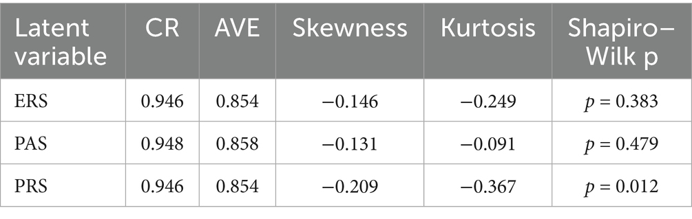Table 9 indicates that all three latent variables demonstrate strong reliability and convergent validity, with composite reliability (CR) values ranging from 0.946 to 0.948 and average variance extracted (AVE) values between 0.854 and 0.858, both exceeding recommended thresholds. The skewness and kurtosis statistics fall within the acceptable range of −1 to +1, supporting the assumption of approximate normality. Although the Shapiro–Wilk test flagged a minor deviation for PRS (p = 0.012), such results are not uncommon in larger samples (N = 300) and are unlikely to compromise the robustness of SEM estimation. Table 10 shows that all HTMT ratios remain below the conservative criterion of 0.90 (ERS–PAS = 0.675, ERS–PRS = 0.841, PAS–PRS = 0.770), thereby providing further evidence of satisfactory discriminant validity across the constructs.