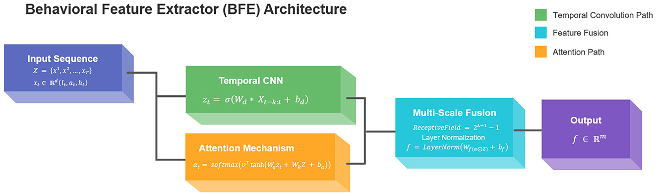 The Behavioral Feature Extractor (BFE) employs a hybrid architecture combining temporal convolutional networks (TCNs) with attention mechanisms to process heterogeneous student interaction logs. Given raw input sequences X = {x1, x2, ..., xT} where each represents a multi-dimensional behavioral observation at timestep t (including response latency lt, accuracy at, and help requests ht), the model first applies dilated causal convolutions: