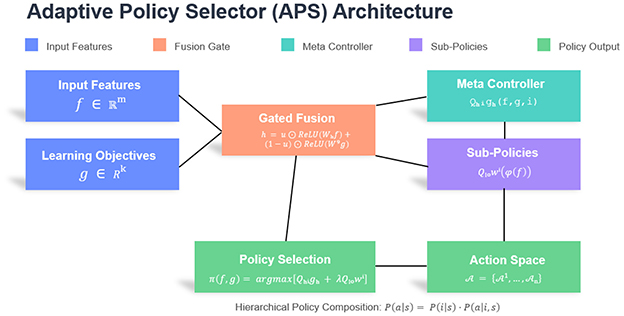The Adaptive Policy Selector (APS) constitutes the decision-making core of our hierarchical learning system, designed to map behavioral feature vectors f ∈ ℝm from the BFE module to optimal instructional strategies. The APS operates on a hybrid architecture combining a policy network with hierarchical Q-learning, formalized as: