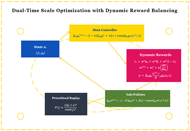 The framework introduces three key innovations: (1) The dual-time scale updates with confidence-based weighting (η) enable coherent strategy optimization across different temporal granularities; (2) The dynamic reward balancing mechanism (Equation 9) automatically emphasizes the most relevant performance metrics for each learning context; (3) The prioritized experience replay is enhanced with pedagogical importance sampling: