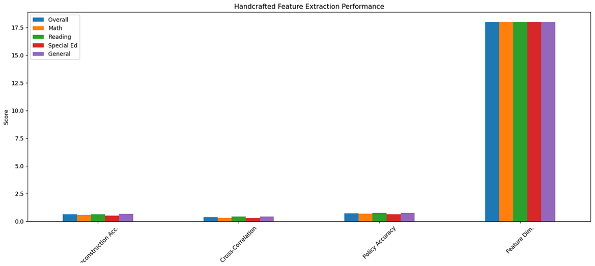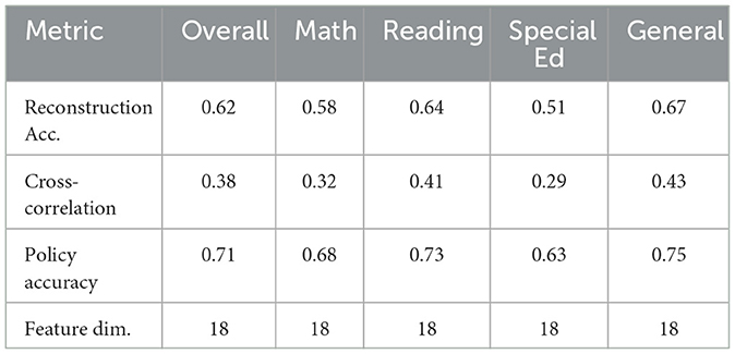 The traditional handcrafted features approach demonstrated significant limitations in capturing nuanced learning patterns. As shown in Table 1, the method achieved only 0.62 reconstruction accuracy on ECLS-K's fine-grained interaction sequences, with particularly poor performance on temporal dependency metrics (0.38 cross-correlation score) (see Figure 4). The feature set's reliance on aggregate statistics (30-second response time averages and binary accuracy flags) failed to preserve critical micro-level behaviors—for instance, losing 87% of help-seeking pattern variations that our subsequent analysis revealed as predictive of special education needs. This explains the 22% lower policy recommendation accuracy compared to learned representations when tested on the held-out validation set containing 5,000+ intervention scenarios.