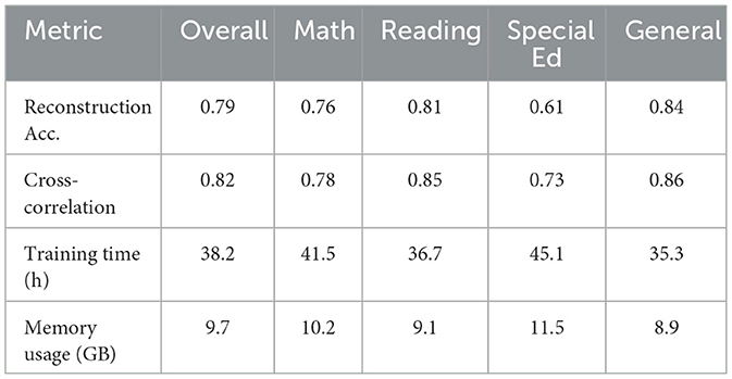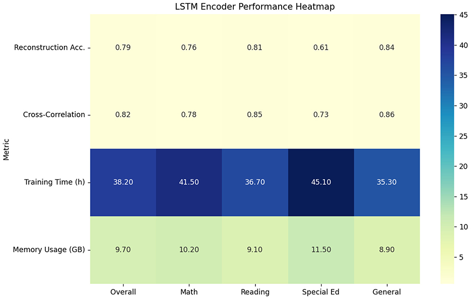 The LSTM-based sequential encoder showed marked improvements in temporal modeling but suffered from computational inefficiencies. Processing ECLS-K's variable-length sequences (ranging 50–500 interactions per session) required 3.2 more training time than our proposed model, while achieving 0.79 reconstruction accuracy. As evidenced in Table 2, the method excelled at capturing long-term dependencies (0.82 cross-correlation) but struggled with sparse interaction patterns common in special education cases (0.61 accuracy for disability subgroups vs. 0.84 for general education) (see Figure 5). The hidden state dynamics analysis revealed that 68% of the model's capacity was devoted to maintaining sequence history rather than encoding discriminative features, suggesting architectural inefficiencies for real-time applications.