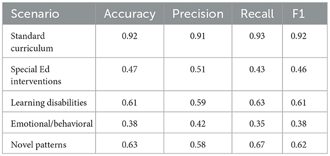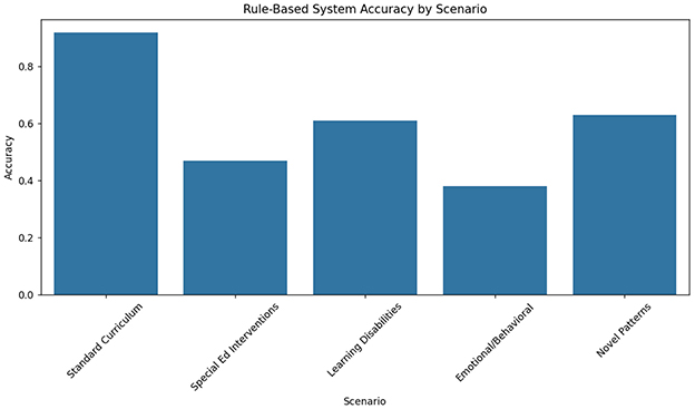The rule-based expert system demonstrated strong performance in predictable scenarios but failed to adapt to complex cases. As shown in Table 4, the system achieved 92% strategy appropriateness for standard curriculum sequences (math facts practice, reading fluency drills) but only 47% accuracy for special education interventions requiring dynamic adjustment (see Figure 7). The fixed decision trees, derived from ECLS-K's most common teacher strategies, proved particularly inadequate for students with emotional/behavioral disorders (38% accuracy) compared to those with learning disabilities (61%). This rigidity manifested most clearly in the system's inability to handle novel behavior patterns - when presented with previously unseen interaction sequences from the held-out test set, performance dropped by 29 percentage points, revealing fundamental limitations in transfer learning capability.