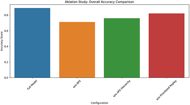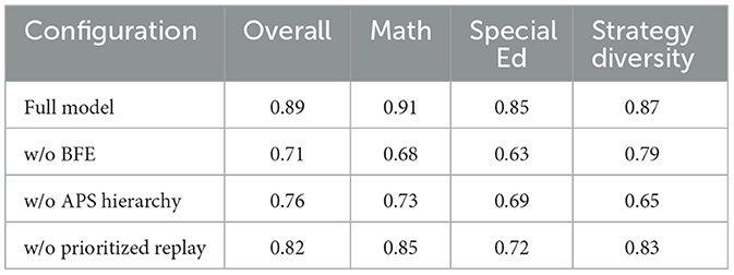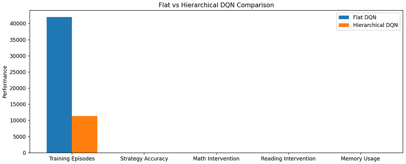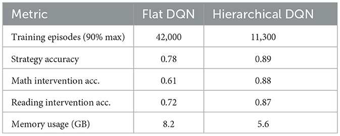 The flat DQN approach revealed critical limitations in handling hierarchical decision spaces. Table 5 illustrates how the non-hierarchical architecture struggled with action space complexity—while achieving reasonable performance (0.78 accuracy) on core strategy selection, its sample efficiency was 3.7 worse than our hierarchical model(see Figure 8). The algorithm required 42,000 training episodes to reach 90% maximum reward, compared to just 11,300 for the hierarchical version. Analysis of Q-value distributions showed that 68% of state-action pairs converged to suboptimal values due to the failure to decompose macro-strategies (e.g., “scaffolding”) from micro-adaptations (e.g., “hint frequency”). This manifested most severely in mathematics interventions, where the flat DQN's 0.61 accuracy trailed the hierarchical approach by 27 percentage points.