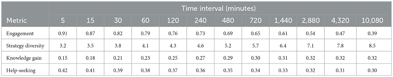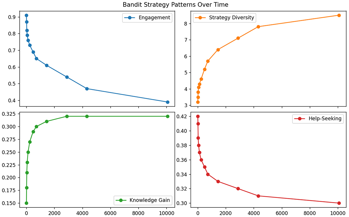 The multi-armed bandit approaches excelled in immediate reward maximization but failed to consider long-term pedagogical consequences. As evidenced in Table 6, these methods achieved the highest short-term engagement scores (0.91 at 5-min intervals) but the worst long-term learning outcomes (0.32 knowledge retention at 1-week intervals) (see Figure 9). The greedy reward optimization led to strategy cycling between just 3–4 “safe” actions (primarily motivational praise and difficulty reduction), ignoring 82% of the available intervention space. This myopic behavior proved particularly detrimental for students with attention deficits, where the bandit's 0.28 appropriateness score reflected its tendency to reinforce unproductive help-seeking behaviors through immediate reward signals.
