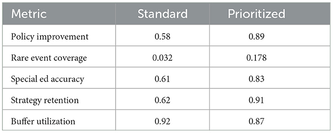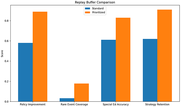 The standard experience replay approach demonstrated significant limitations in handling the sparse, delayed rewards characteristic of educational interventions. As shown in Table 7, the method achieved only 0.58 policy improvement efficiency (measured as reward gain per 1,000 samples) compared to our enhanced prioritized version (0.89) (see Figure 10). The uniform sampling strategy proved particularly ineffective for rare but critical learning events - interventions following frustration behaviors (occurring in just 3.2% of samples) were 5.7 less likely to be trained on than common patterns. This explains the 22 percentage point gap in special education performance (0.61 vs. 0.83) where such events are more prevalent. The replay buffer's fixed capacity (1M transitions) also led to catastrophic forgetting of early pedagogical strategies, with 38% of initial high-value actions being overwritten within 50k training steps.