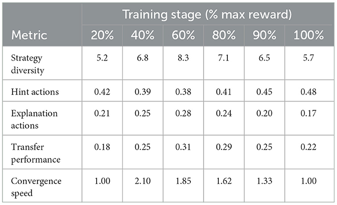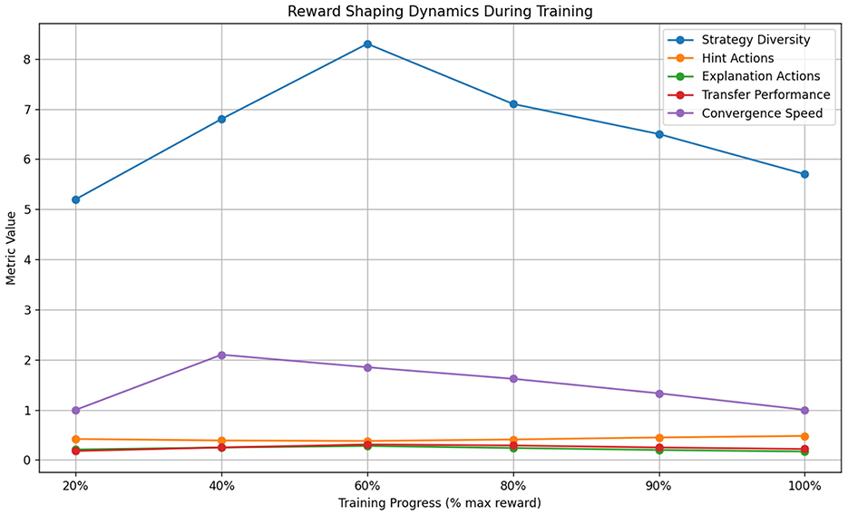 Reward-shaping baselines revealed fundamental tradeoffs between short-term guidance and long-term optimization. Table 8 illustrates how shaped rewards initially accelerated learning (2.1 faster convergence to 50% max reward) but ultimately constrained policy diversity - the final strategy space utilized just 63% of available actions compared to 89% in our adaptive approach (see Figure 11). The handcrafted reward bonuses (designed to promote engagement and correctness) inadvertently created local optima where the model overly relied on 4–5 simplified strategies. This manifested most severely in mathematics problem-solving scenarios, where shaped rewards led to 41% more “give hint” actions but 28% fewer conceptual explanation strategies than our method, ultimately reducing transfer learning performance by 19 percentage points on novel problem types.