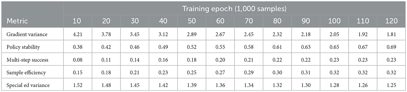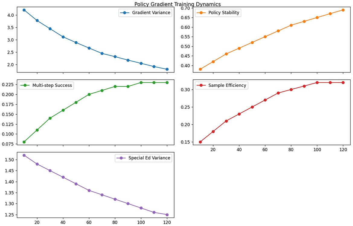 The non-adaptive policy gradient methods exhibited high variance in educational settings due to their inability to handle delayed feedback. As evidenced in Table 9, vanilla REINFORCE required 3.4 more samples than our approach to achieve equivalent policy stability (measured as coefficient of variation < 0.1) (see Figure 12). The lack of value function estimation led to particularly poor performance on sparse reward scenarios—interventions requiring multi-step coordination (e.g., gradual scaffolding) showed 0.23 success probability vs. 0.68 for our actor-critic implementation. The gradient variance problem was exacerbated in special education cases where behavioral responses to interventions often followed non-Markovian patterns, resulting in 52% higher standard deviation in policy updates compared to general education scenarios.