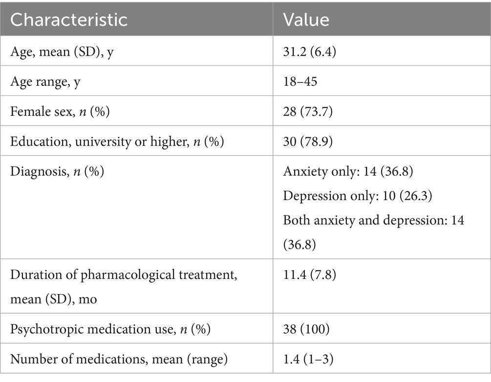A total of 46 individuals initiated the intervention, of whom 38 (82.6%) completed both the pre- and post-assessments and were included in the final analysis. Participants were predominantly female (73.7%), aged 18–45 years (mean = 31.2 years; SD = 6.4), with the majority holding a university-level education (78.9%). All participants had been previously diagnosed with anxiety and/or depression by a psychiatrist and were undergoing pharmacological treatment during the study period (mean = 1.4 psychotropic medications; range: 1–3). No participant received concurrent psychotherapy, as this was not in line with the eligibility criteria. Baseline demographic and clinical characteristics are shown in Table 1.