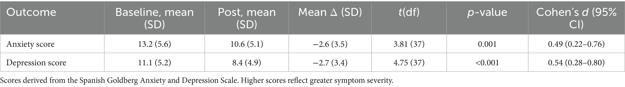 Depression symptoms: Mean scores decreased from 11.1 (SD = 5.2) to 8.4 (SD = 4.9) (Δ = −2.7, SD = 3.4), t(37) = 4.75, p < 0.001, Cohen’s d = 0.54, 95% CI [0.28, 0.80]. Figure 4 illustrates pre–post distributions.