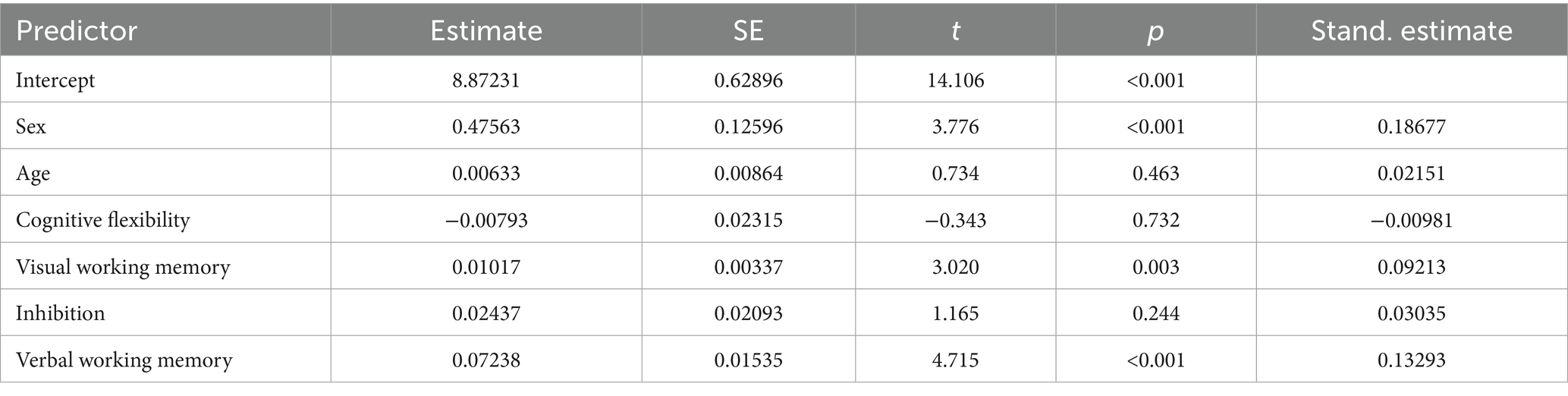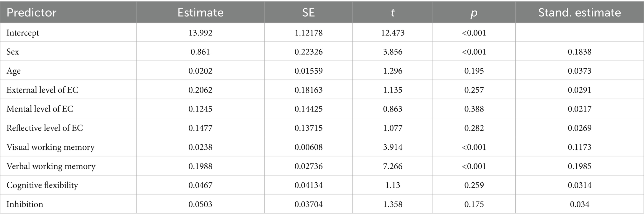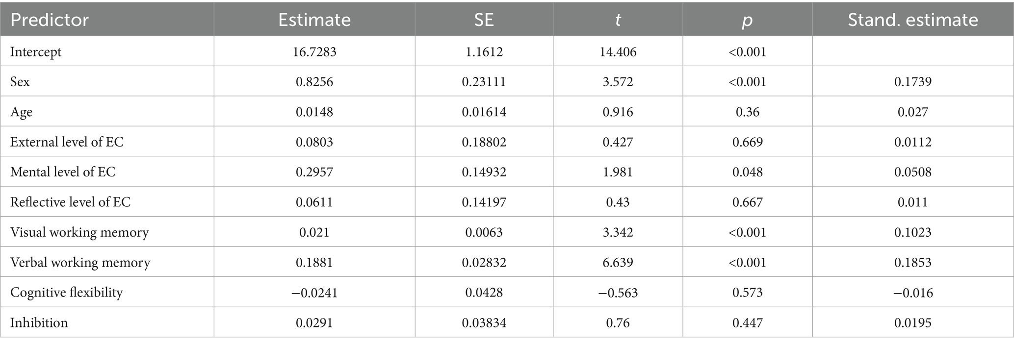 Finally, at the third stage, the model was expanded to include all three blocks: sex, age, EF components, and EC (Model 3). The resulting model was significant (adjusted R2 = 0.080, F = 16.2, df₁ = 9, df₂ = 1,560, p < 0.001). Significant predictors in Model 3 included visual working memory (β = 0.102, t = 3.34, p < 0.001), verbal working memory (β = 0.185, t = 6.39, p < 0.001), the mental level of EC (β = 0.05, t = 1.98, p = 0.048), and sex.