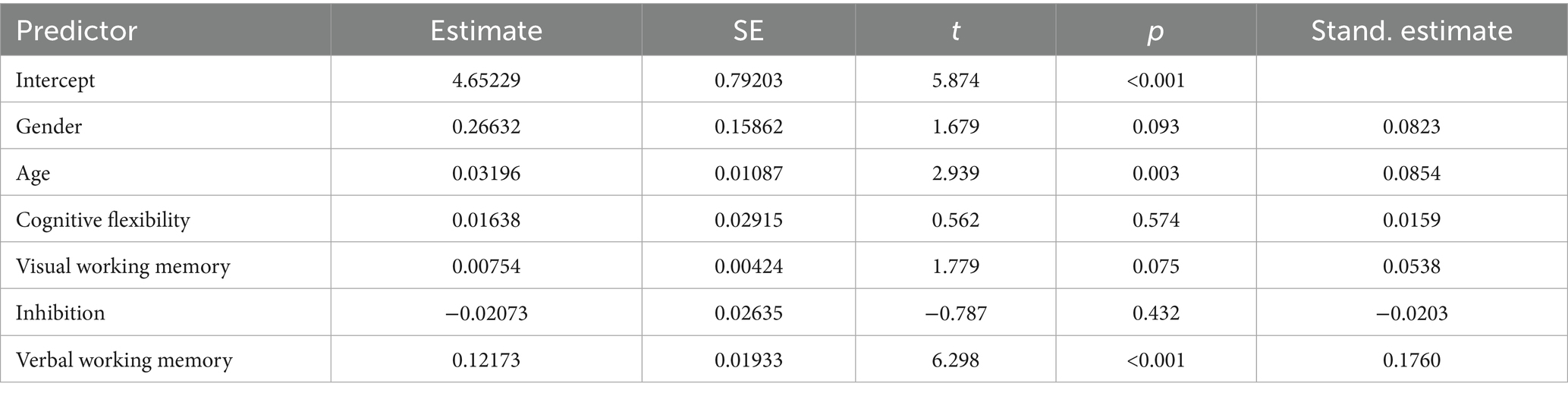 At the second stage, the baseline model was first supplemented with a block of EF components (Model 2.1), resulting in a significant model (adjusted R2 = 0.064, F = 18.8, df₁ = 6, df₂ = 1,563, p < 0.001). Significant predictors included verbal working memory (β = 0.176, t = 6.29, p < 0.001) and age.