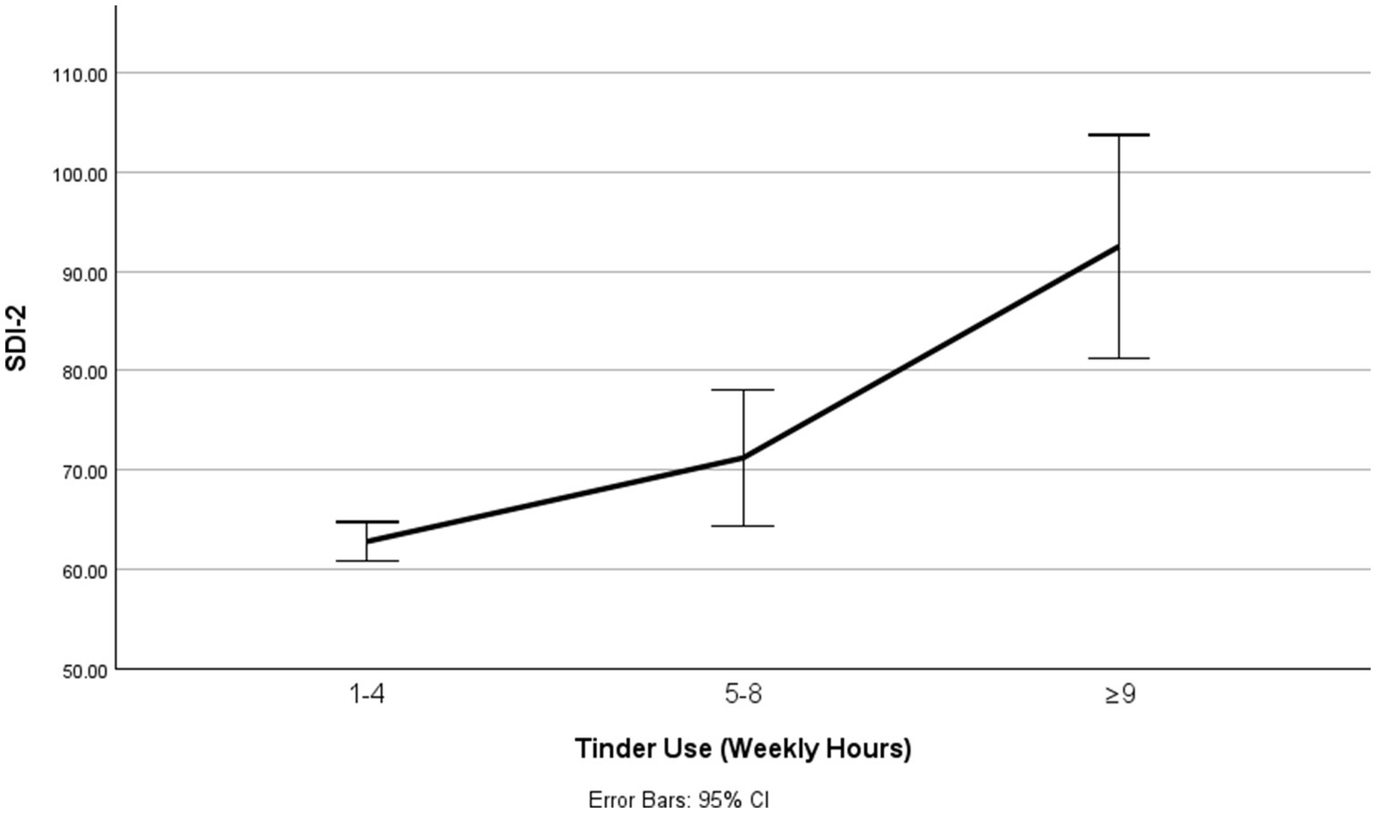 All relevant assumptions for regression analyses were tested and met, including normality of residuals, homogeneity of variance, and absence of multicollinearity. A simple linear regression analysis showed that Tinder use was significantly associated with SDI-2, adjusted R² = 0.11, β = 0.33, F (1, 303) = 37.80, p < 0.001, f ² = 0.12, indicating a moderate effect. A positive association was found between Tinder use and SDI-2, B = 13.02, SE = 2.12, t (303) = 6.15, p < 0.001, 95% CI [8.85, 17.19]. Each category increase in weekly Tinder use (1-4 hours → 5-8 hours → ≥ 9 hours) corresponded to a 13-point increase in SDI-2 scores. While statistically robust, the effect size is modest and should be interpreted accordingly. These results support H3 in terms of association, but causal inference is not warranted due to the cross-sectional design (see Table 2 and Figure 2).