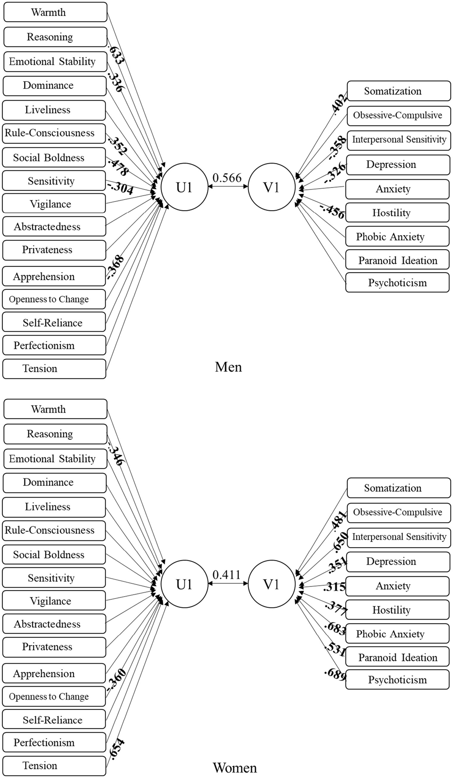To examine the multivariate association between personality traits and mental-health dimensions, we performed canonical correlation analysis (CCA) using the 16PF primary factors (16 variables) as predictors and the SCL-90 symptom dimensions (9 variables) as criteria (Hardoon et al., 2004). All variables were standardized (z-scores) prior to analysis. The CCA was performed separately for men and women, as well as for the total sample, to explore potential gender differences in the multivariate association patterns (Akour et al., 2023; Li et al., 2023). Although both scales include a large number of items, the analysis was conducted at the dimension level (16 personality factors and 9 symptom dimensions) rather than at the item level. With 25 composite variables and 329 participants, the sample size was sufficient according to established guidelines for canonical correlation analysis (Stevens, 2002).