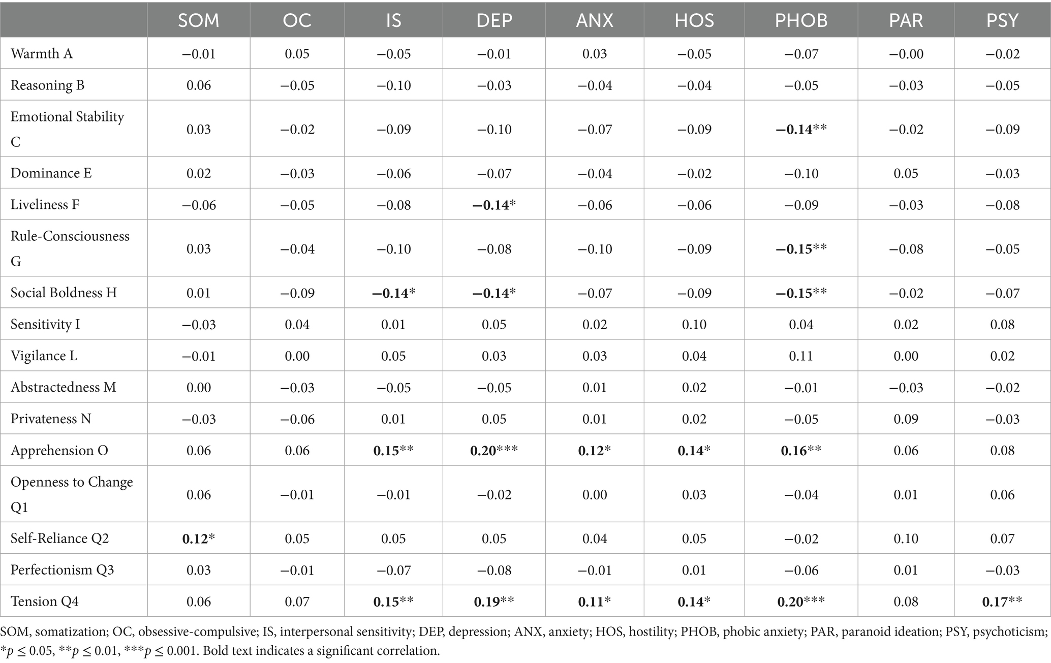 When comparing the mental health of young doctoral faculty members with the national norm, we identified some noteworthy results. The results of the bivariate correlation analysis between personality traits and mental health are presented in Table 1. Based on the SCL-90 scale, mental health was assessed using a threshold of a total score exceeding 160 points or a mean score greater than 2 for any factor (Fang et al., 2023; Hou et al., 2020). The results showed that the prevalence of mental health issues among young doctoral faculty members was 16.70% (55/329). Among the SCL-90 factors, the prevalence rates from highest to lowest were: obsessive-compulsive symptoms 11.90% (39/329), interpersonal sensitivity 6.08% (20/329), other symptoms (sleep and eating disturbances) 4.56% (15/329), and paranoid ideation 2.74% (9/329). These data suggest that young doctoral faculty members face significant mental health challenges, particularly regarding obsessive-compulsive symptoms and interpersonal sensitivity.