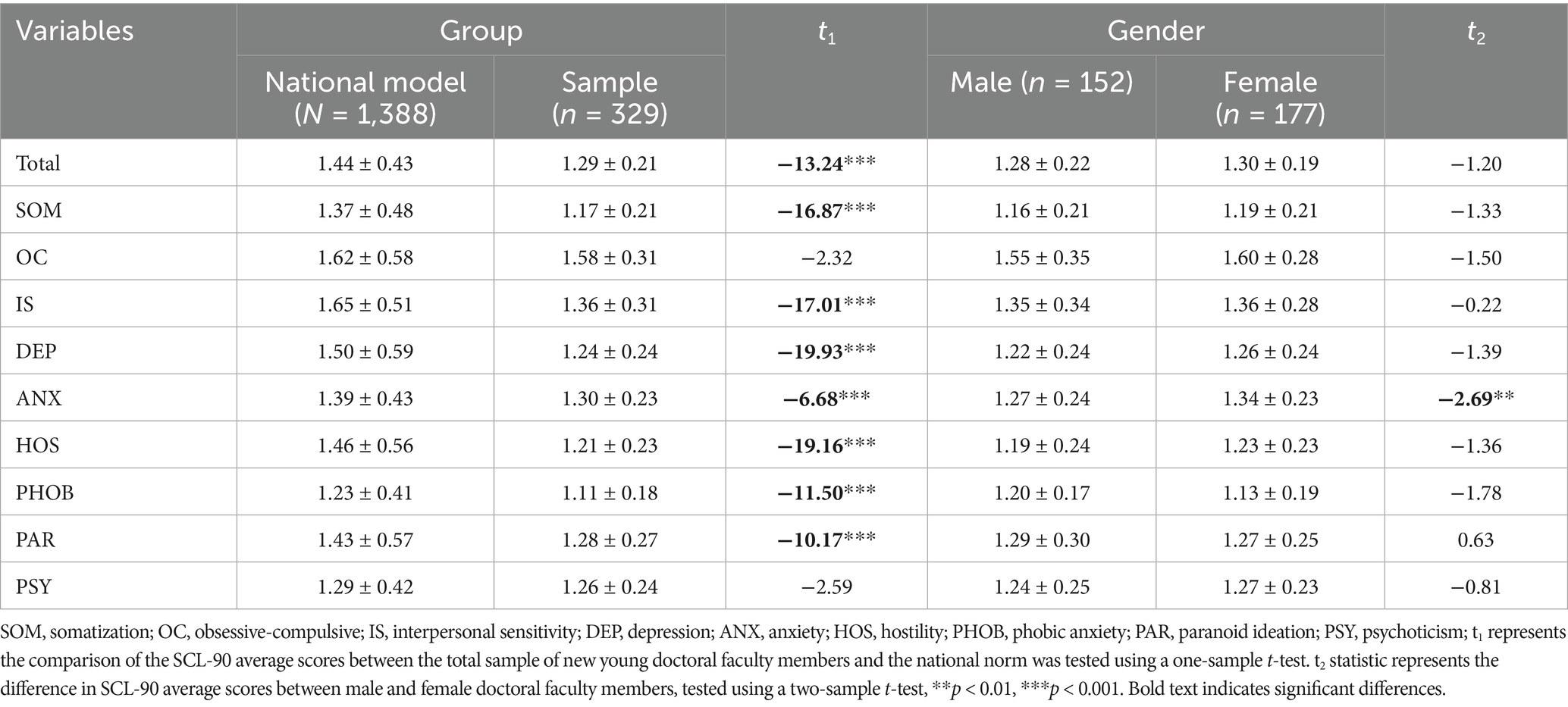 Analysis of gender differences in mental health among young doctoral faculty members showed minimal sex-based variation. As shown in Table 2, mental health outcomes were significantly correlated with gender. Anxiety was the only subscale demonstrating a significant sex difference, with female participants scoring higher than males (t2 = −2.69, p < 0.01). No significant differences emerged across other SCL-90 subscales: somatization, obsessive-compulsive, interpersonal sensitivity, depression, hostility, phobic anxiety, paranoid ideation, or psychoticism (p > 0.05).