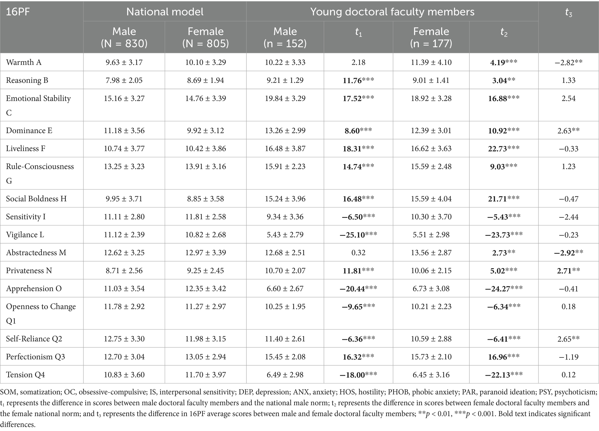 When comparing the 16PF scores with the national norm, doctoral faculty members scored significantly higher than the national norm in reasoning, emotional stability, dominance, liveliness, rule-consciousness, social boldness, privateness, and perfectionism (p < 0.01). Conversely, they scored significantly lower in sensitivity, vigilance, apprehension, openness to change, and tension (p < 0.01).