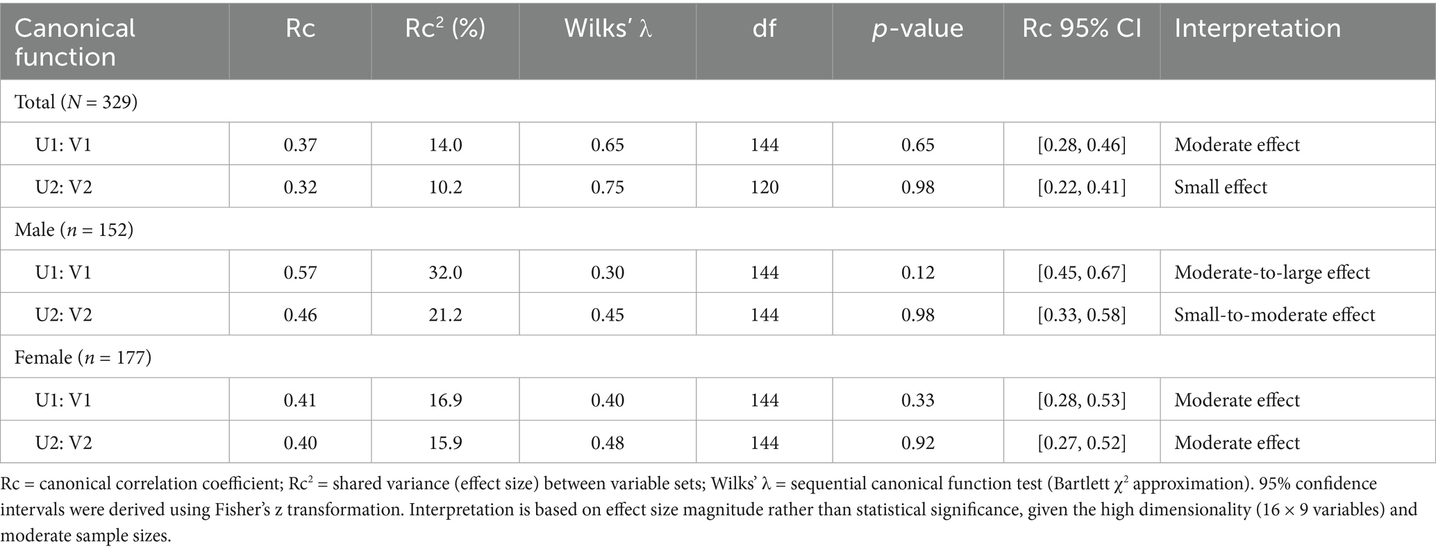 Canonical functions were extracted sequentially, each representing a pair of synthetic variates (u, v) that maximize the shared variance between the 16PF and SCL-90 variable sets. The significance of each canonical function was assessed using Wilks’ λ with Bartlett’s χ2 approximation. Because the CCA was conducted across three subsamples (total, men, and women) and multiple canonical roots, we applied the Benjamini–Hochberg false discovery rate (FDR) correction (Benjamini and Hochberg, 1995) to control for inflated Type I error due to multiple testing. After adjustment, none of the canonical functions reached q < 0.05, and results were thus interpreted as exploratory and descriptive rather than inferential.