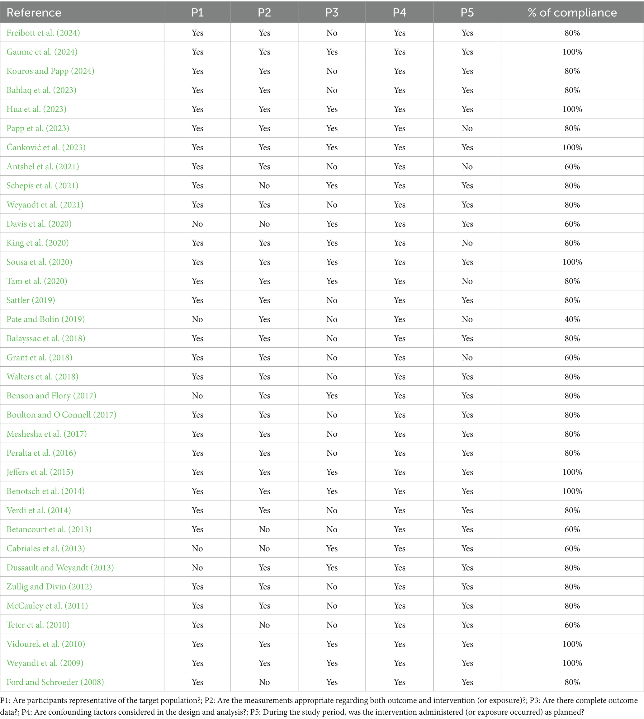 The methodological quality of the studies was assessed using the Mixed Methods Appraisal Tool (MMAT) (Hong et al., 2018). The MMAT is a critical appraisal tool designed for systematic reviews that include quasi-experimental empirical studies (Table 1). For this study, only studies providing quantitative data were included. The assessment of methodological quality for each study is presented in Table 1. A decision was made to select studies with a minimum of 60% methodological quality.