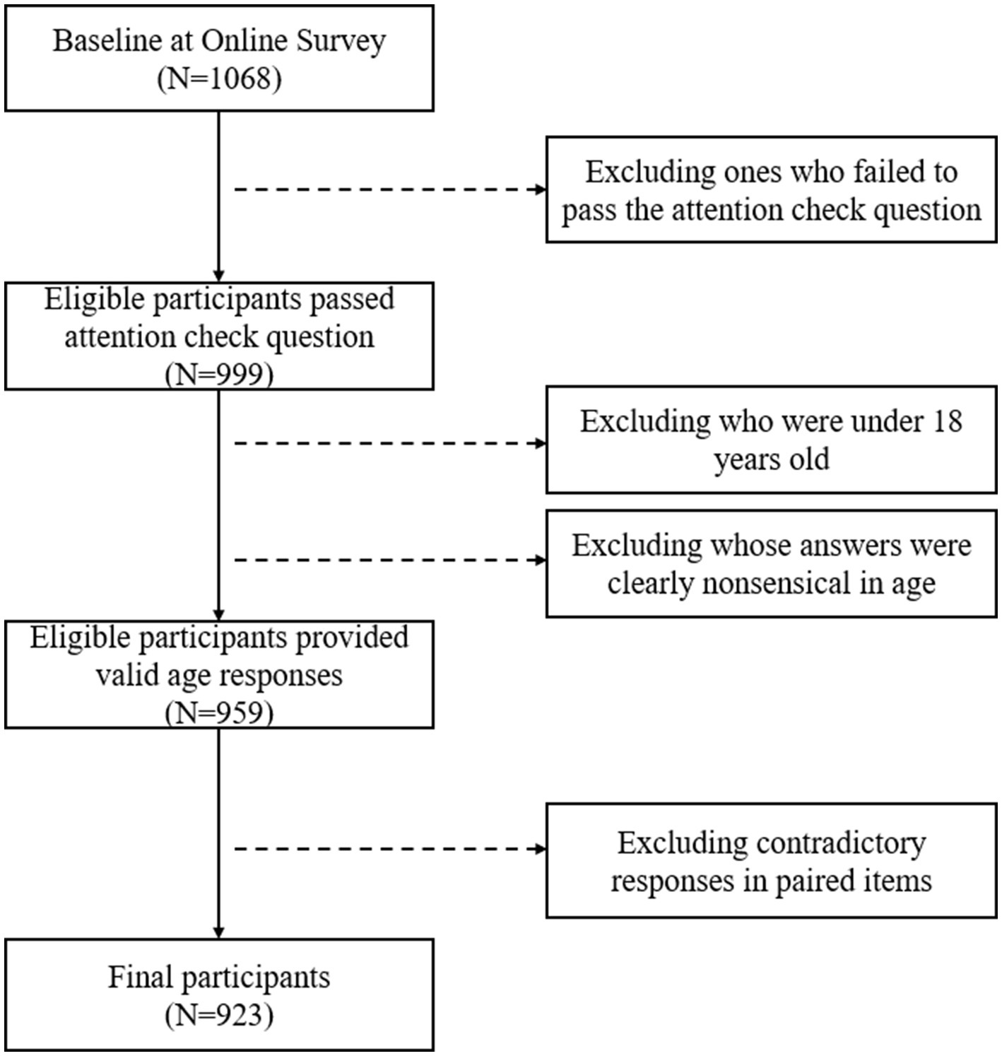A total of 1,068 individuals completed the online survey. To ensure data quality and ethical compliance, a multi-step screening procedure was applied to the raw responses. First, an attention check item was embedded in the questionnaire (“Please select ‘Moderate’ for this question”). Participants who failed this check were excluded, resulting in 999 valid participants. Second, individuals younger than 18 years old, as well as respondents whose answers were clearly nonsensical (e.g.: not a number), were removed, leaving 959 participants. Third, two pairs of questions with contradictory meanings were used to further detect random or careless responses, ‘I feel very secure’ and ‘I feel very fearful’. The answer of ‘I feel very fearful’ did reverse-scoring first. Participants who endorsed mutually exclusive extreme values (e.g., responding “1” to one item and “4” to its opposite) were excluded. After this final screening step, the analytic sample comprised 923 participants. The flowchart of participants screening is shown in Figure 1. Thirty participants were asked to answer the scale again the day after first participating, for the purpose of test–retest. All participants were Chinese and speaking Mandarin. The background information of participants is shown in Table 1.