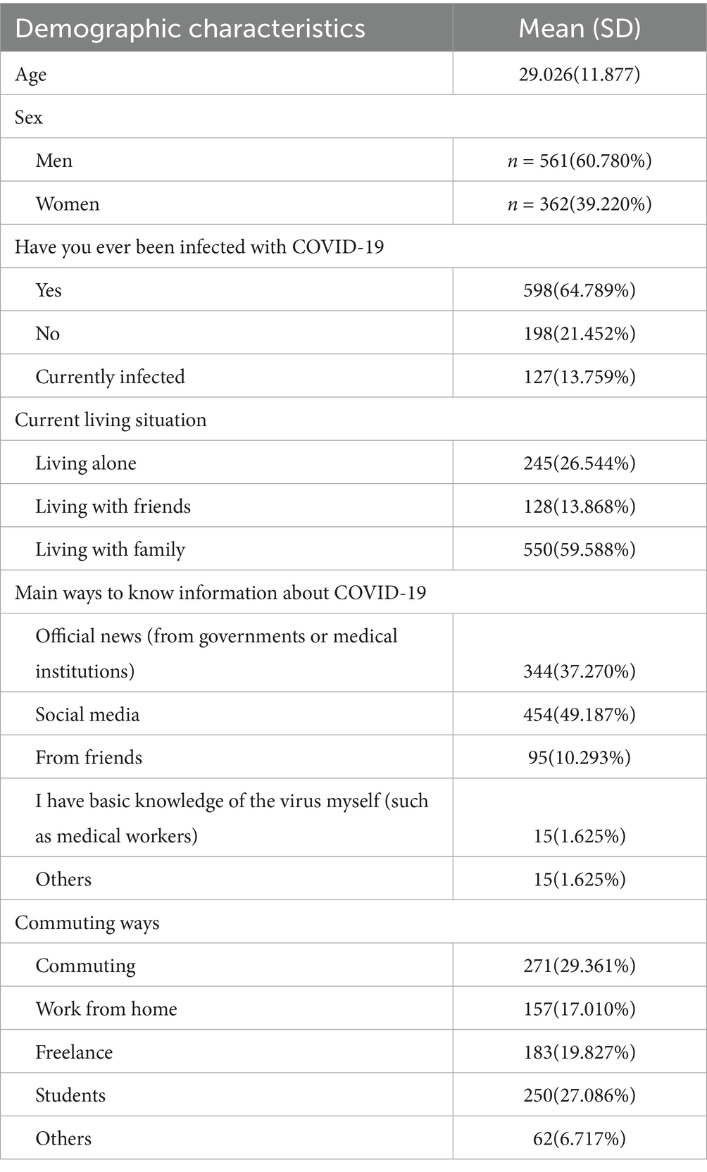 There were 923 participants, aged from 18 to 83 years old, average aged 29.026 years old (SD ± 11.877), finished the whole questionnaire, including the demographic information and the scale (PFPA). Of 923 individuals, 561 were men and 362 were women. Five hundred and ninety-eight participants had experienced infecting COVID-19, 198 had not, and 127 were in the process of recovering from COVID-19.