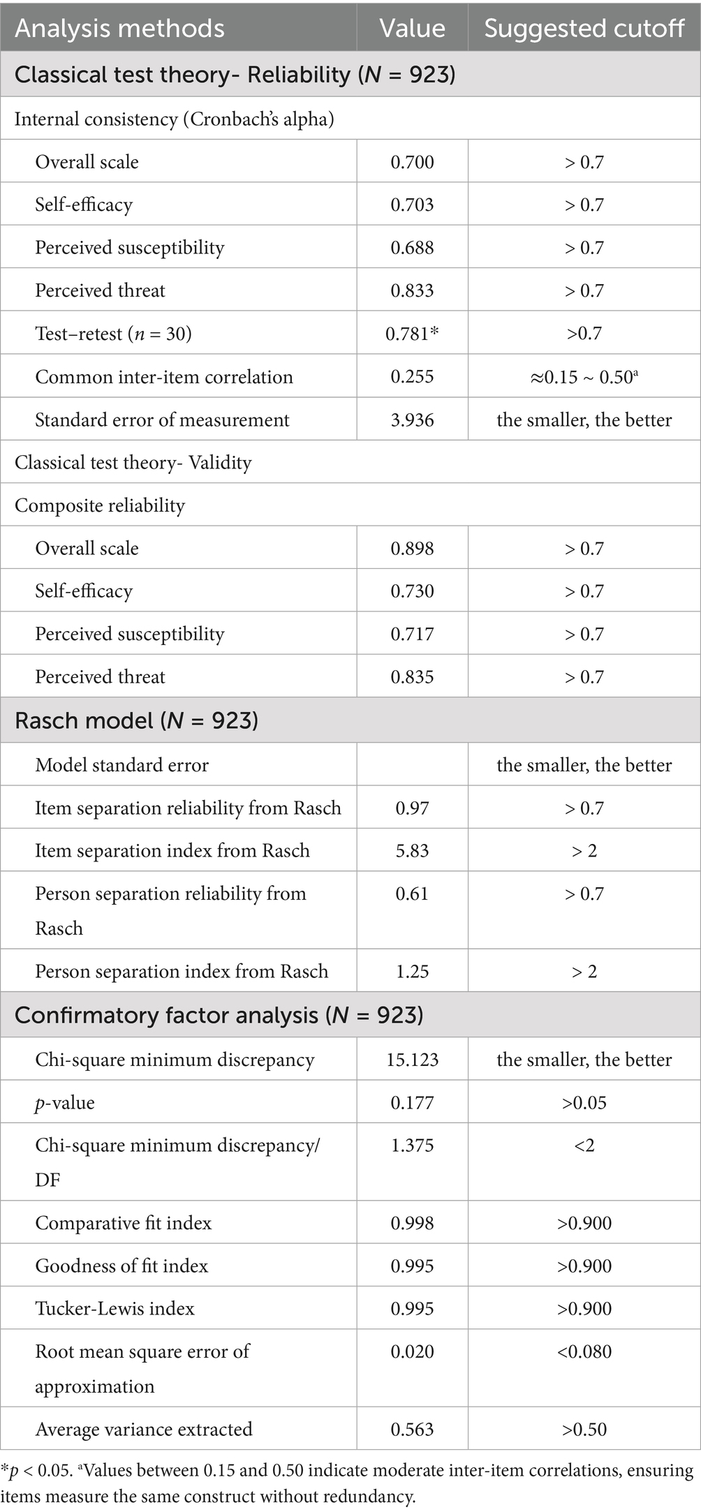 Classical Test Theory (CTT) analysis was conducted to evaluate the reliability of the PFPA scale with a sample of 923 participants. As shown in Table 2, the overall scale demonstrated acceptable internal consistency (Cronbach’s α = 0.700), with subscale alphas: 0.703 (Self-efficacy), 0.688 (perceived susceptibility), and 0.833 (perceived threat). Test–retest reliability was evaluated using the Intraclass Correlation Coefficient (ICC(2,1), two-way random effects, single measure, absolute agreement) for a subsample of 30 participants, with the 95% confidence interval calculated using Fisher’s Z transformation [0.590, 0.891], p < 0.001. The common inter-item correlation was 0.255, indicating moderate item interrelatedness, and the SEM was 3.936, reflecting adequate precision for a new scale. Item-level statistics, including corrected item-total correlations (0.205–0.528) and alpha if item deleted (0.638–0.714), confirmed no item substantially reduced reliability, as shown in Table 3.