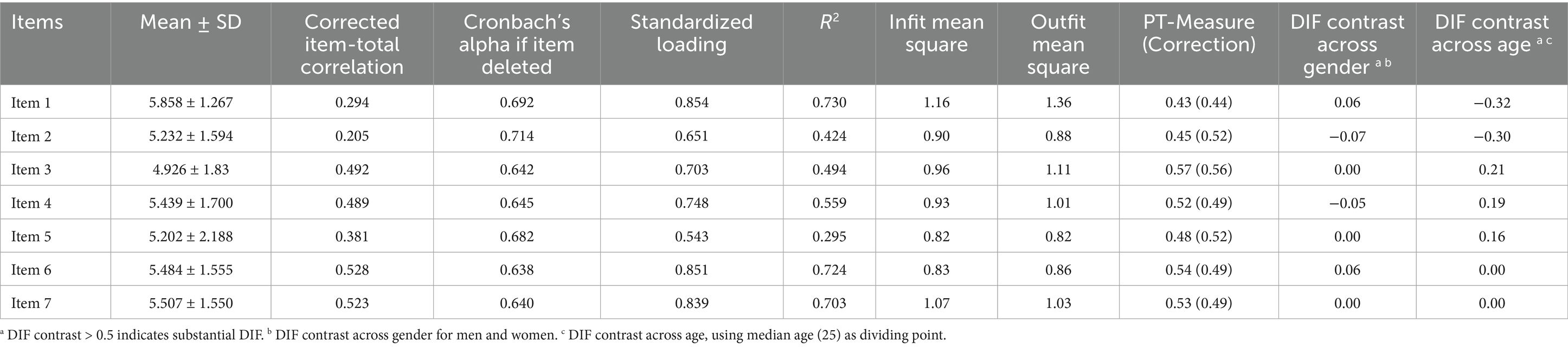 Rasch analysis included item and person separation reliability, item and person separation indices, point–measure correlations (PT-Measure), differential item functioning (DIF) across sex and age (median split at 25 years), and infit and outfit mean-square statistics (MNSQ).