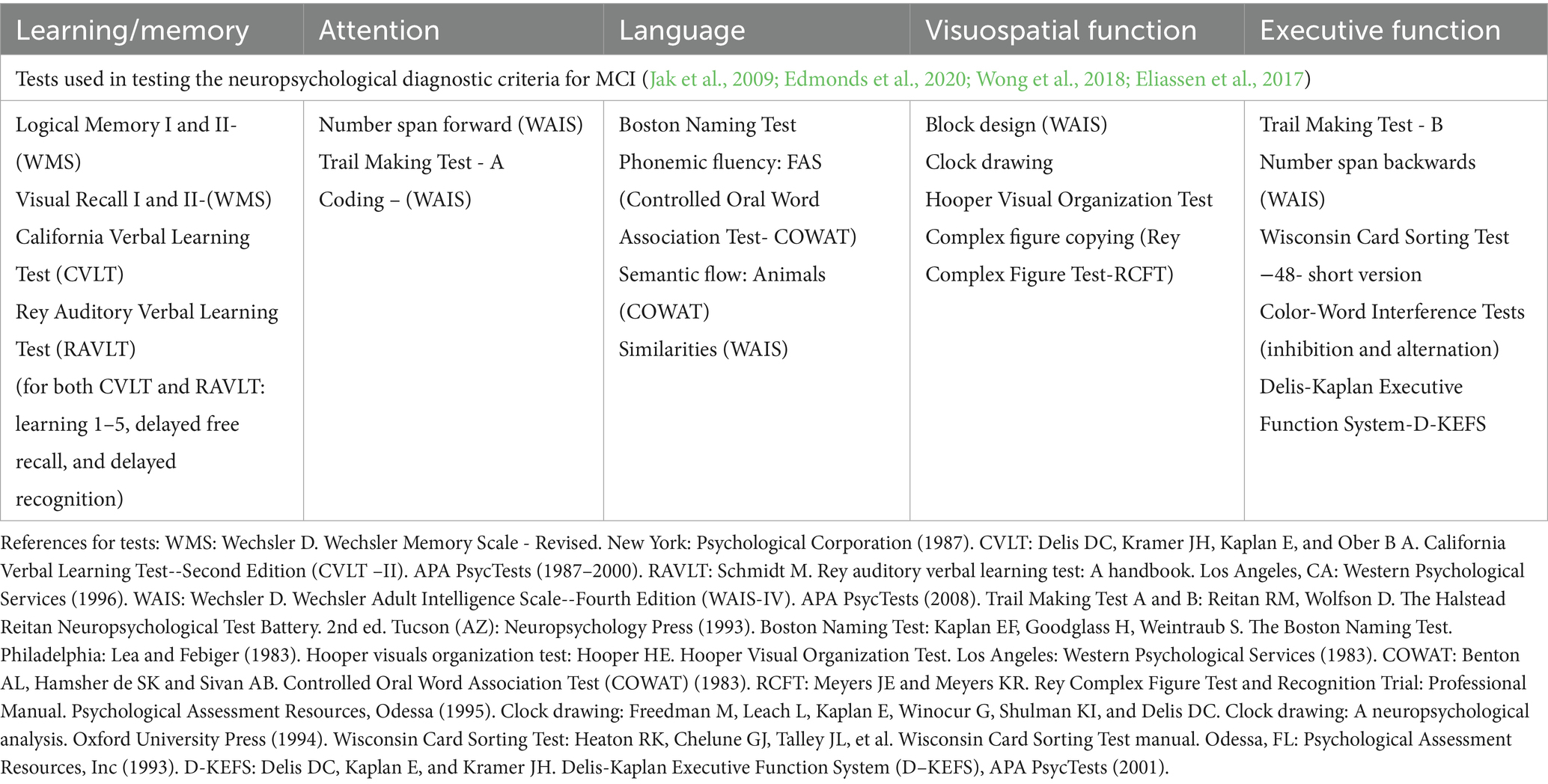 The neuropsychological method (Jak et al., 2009) has been validated against biomarkers and progression of cognitive impairment. Regardless of which tests have been used, regardless of age groups and geographical area, similar results have been obtained with regard to sensitivity, specificity and longitudinal prediction, which is considered to provide further support for this diagnostic algorithm for MCI (Jak et al., 2009; Bondi et al., 2014; Eliassen et al., 2017; Wong et al., 2018; Edmonds et al., 2020). Table 1 provides an overview of cognitive domains (NIA-AA criteria, DSM-5 and ICD-11) and tests used in the validation of the Jak/Bondi criteria for MCI (Jak et al., 2009).