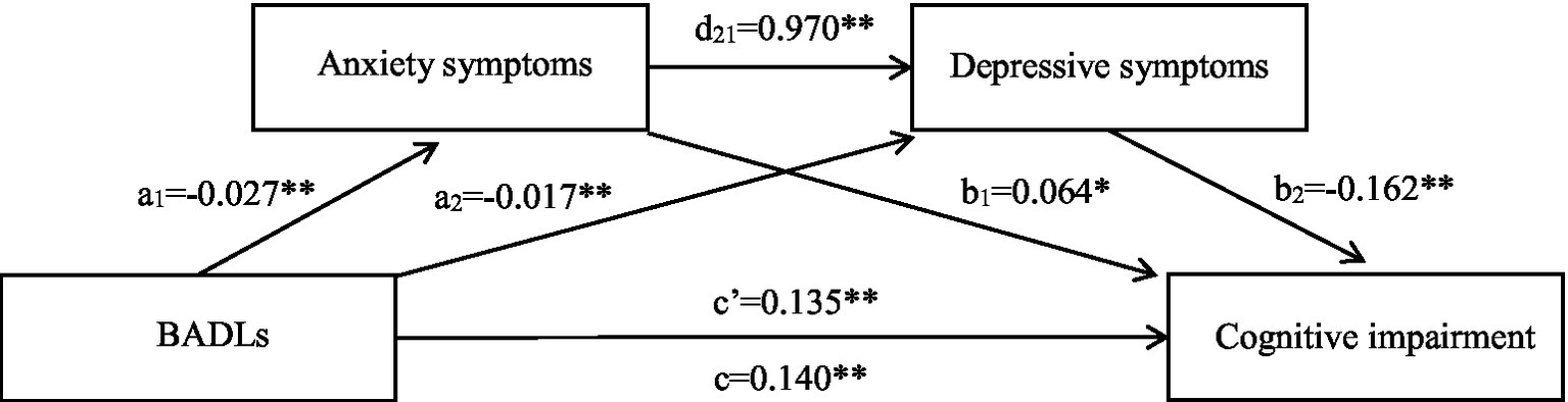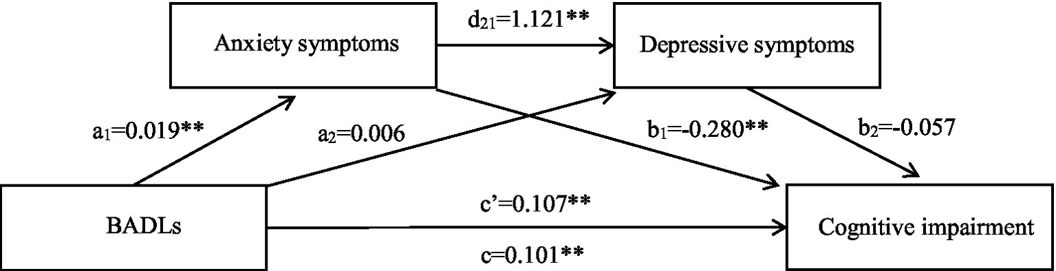 BADLs, anxiety symptoms, depressive symptoms, and cognitive impairment were significantly related (all P < 0.01). When adjusting for sociodemographic and health-related factors, BADLs limitations had a direct positive effect on cognitive impairment among participants with religious beliefs [effect = 0.107, 95% confidence interval (CI): 0.095, 0.121], but also had indirect effect via independent suppressing of anxiety symptoms (effect = −0.005, 95%CI: −0.010, −0.002). For participants without religious belief, BADLs limitations had a direct positive effect on cognitive impairment (effect = 0.135, 95%CI: 0.129, 0.140) as well as an indirect effect via three paths: an independent suppressing effect of anxiety symptoms (effect = −0.002, 95%CI: −0.004, −0.0001), independent mediation of depressive symptoms (effect = 0.003, 95%CI: 0.002, 0.004), and serial mediation of anxiety and depressive symptoms (effect = 0.004, 95%CI: 0.003, 0.006).
