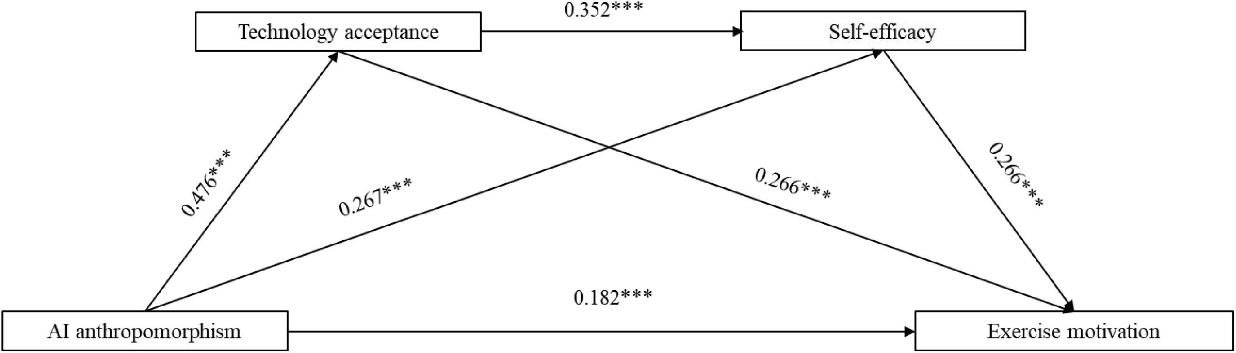 Figure 1. The chain mediating model of AI anthropomorphism on exercise motivation. ***Indicates p < 0.001.