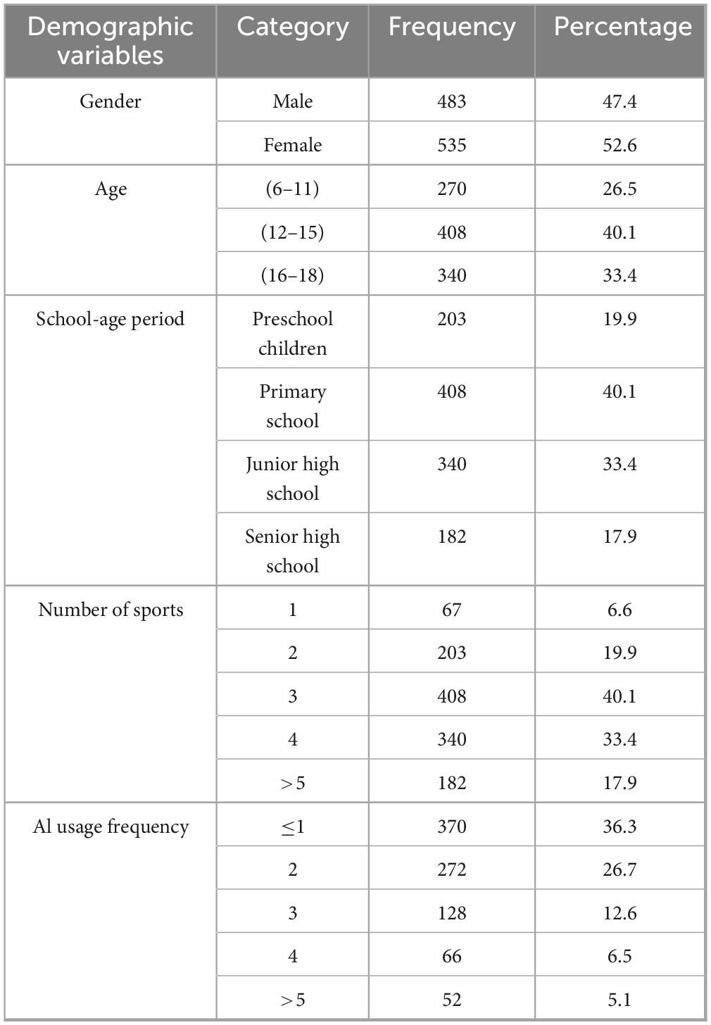 In order to establish a foundational understanding of the study participants, descriptive statistics were utilized to summarize the demographic profile of the valid sample (N = 1,018). Among the valid surveyed participants, 483 were male, accounting for 47.4%, while 535 were female, comprising 52.6%. The respondents were aged between 6 and 18 years old, with the 12–15 age group accounting for the highest proportion. Regarding school-age periods, 19.9% were preschool children, 40.1% were primary school students, 33.4% were junior high school students, and 17.9% were senior high school students. The number of sports projects mastered by the respondents varies, and the proportion of those who master three sports is the highest. In terms of AI usage frequency, the proportion of people who use AI 1–2 times a week is relatively high. The proportions of these two frequencies are 36.3% and 26.7%, respectively, with a total proportion of 63%. The demographic information is shown in Table 1.