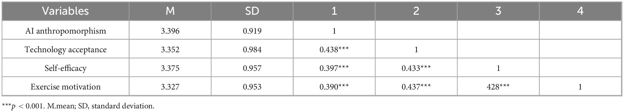 This study used SPSS 27.0 to analyze the reliability and validity of variables. The study showed that the Cronbach’s α coefficients of all variables exceeded 0.9. Specifically, the coefficient for AI anthropomorphism was 0.918, for technology acceptance was 0.907, for self-efficacy was 0.902, and for exercise motivation was 0.915. The KMO values is 0.958, and Bartlett’s test of sphericity was significant (p < 0.01).