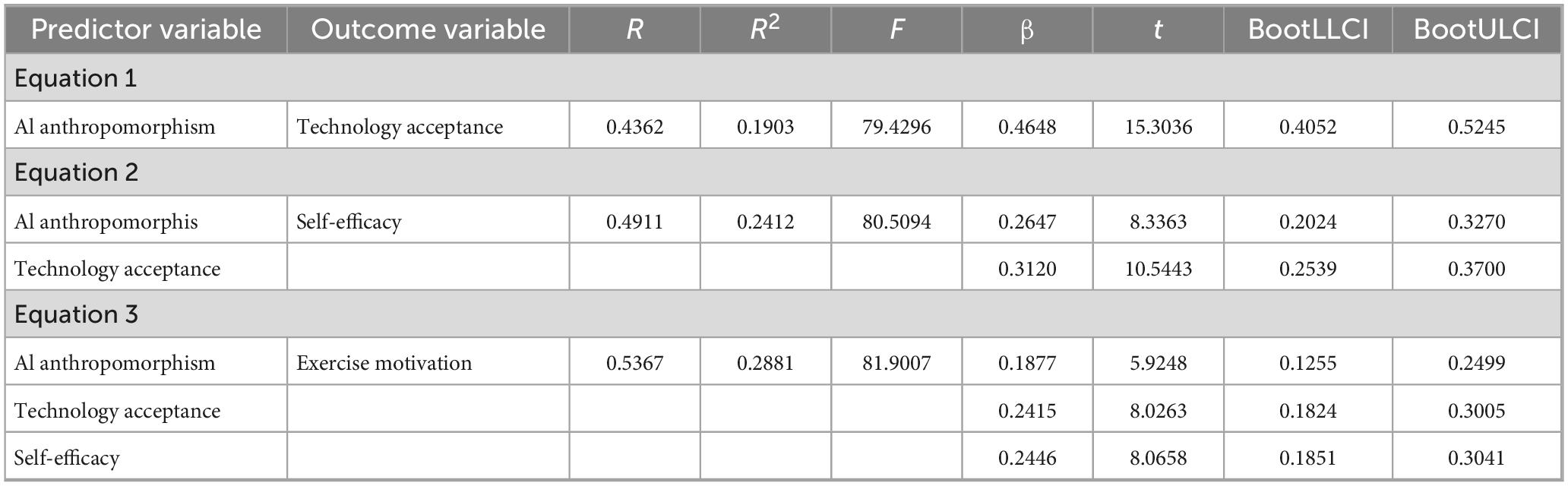 All four models yielded significant results (p < 0.001), as shown in Table 5. Equation 1 revealed a notably positive relationship between AI anthropomorphism and exercise motivation. Equation 2 revealed that AI anthropomorphism, together with technology acceptance, was positively correlated with self-efficacy. Equation 3 showed that AI anthropomorphism, together with technology acceptance and self-efficacy, had significantly positive effects on exercise motivation.